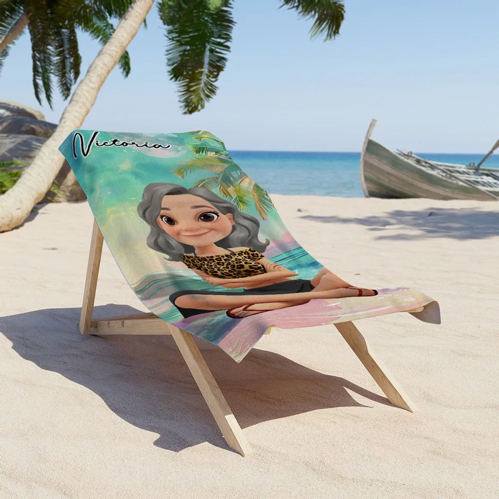 Bring a touch of personality and joy to your summer adventures with this personalized beach towel. Featuring a charming cartoon girl in a swimsuit, framed by tropical palm trees, it’s a fun and heartwarming way to make your beach days extra special. Add your custom name to make it truly yours or create a thoughtful gift for someone you love.