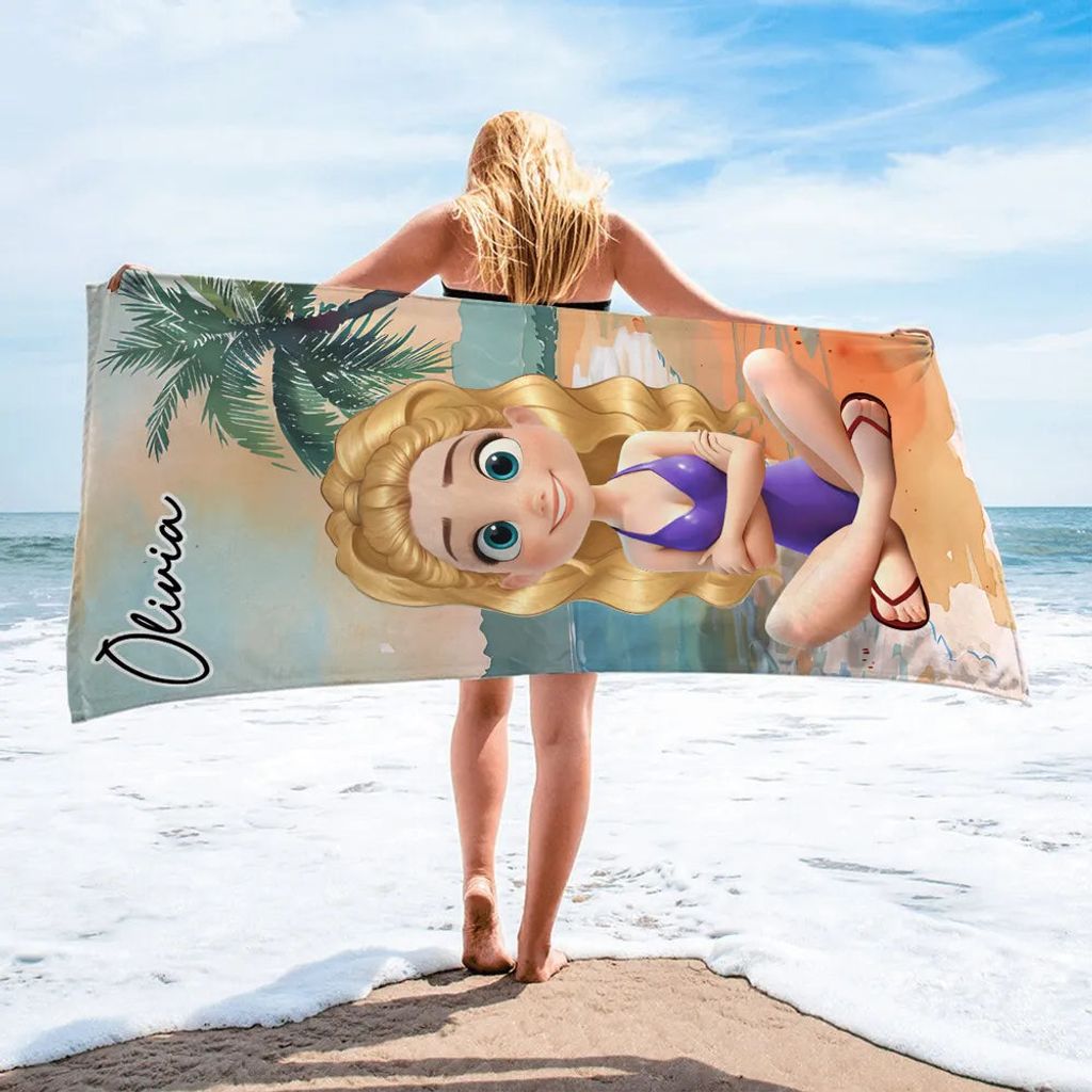 Personalized Beach Towel with Cartoon Girl – Summer Beach Gift for Her, Custom Name Towel for Vacation and Pool Days
