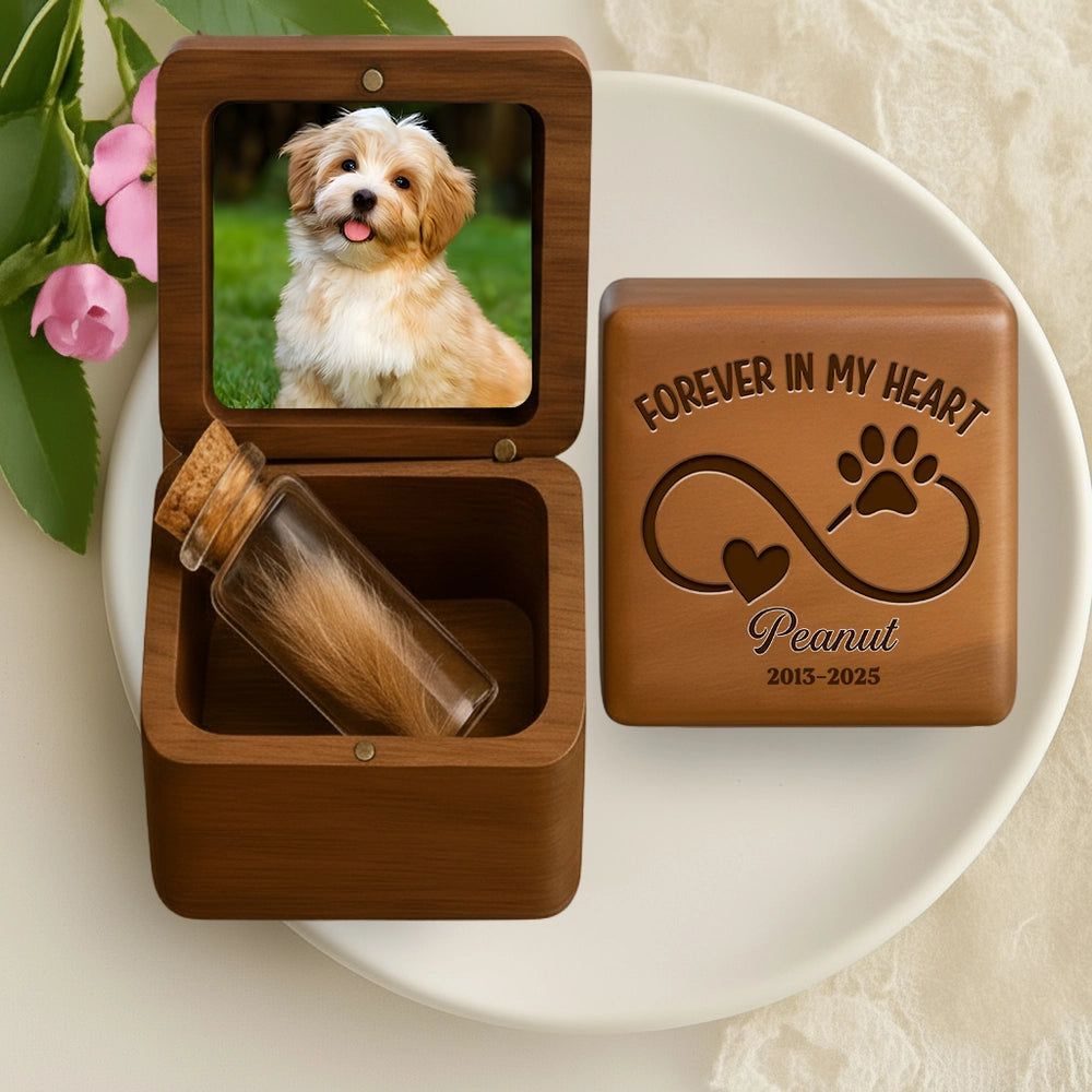 The box features a photo slot on the lid and a secure vial inside for pet hair, creating a tangible reminder of precious memories. Its natural wood tone and fine craftsmanship evoke a soothing atmosphere.