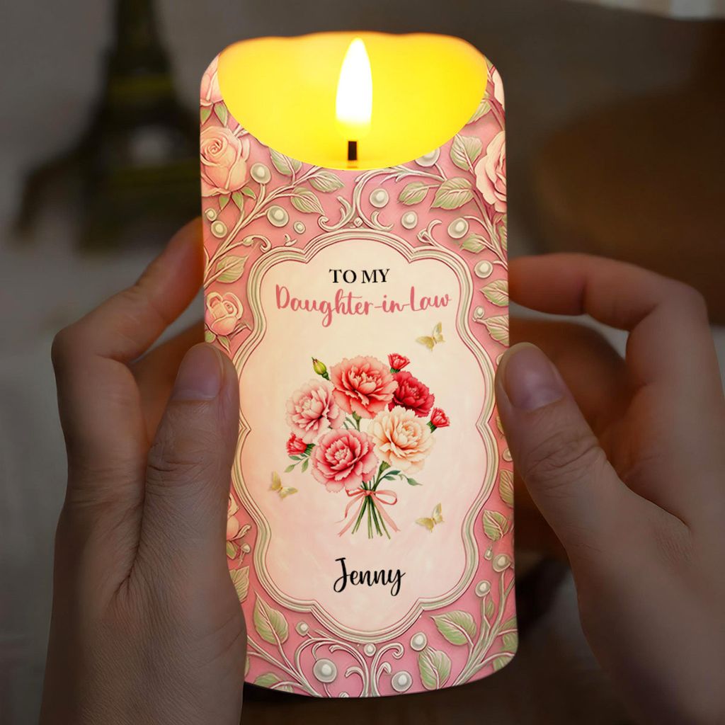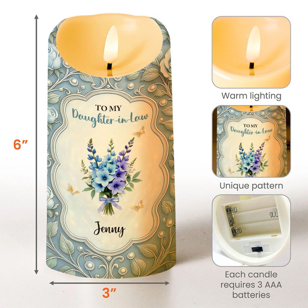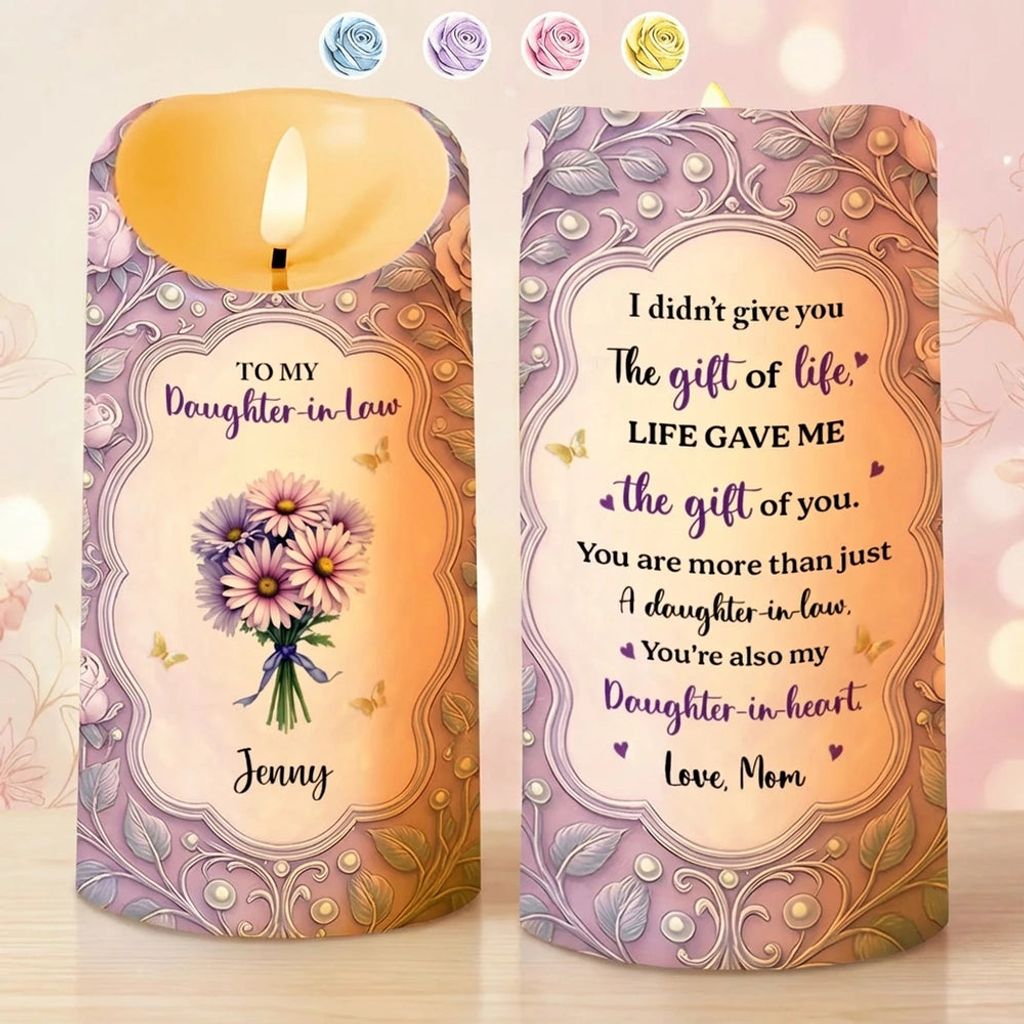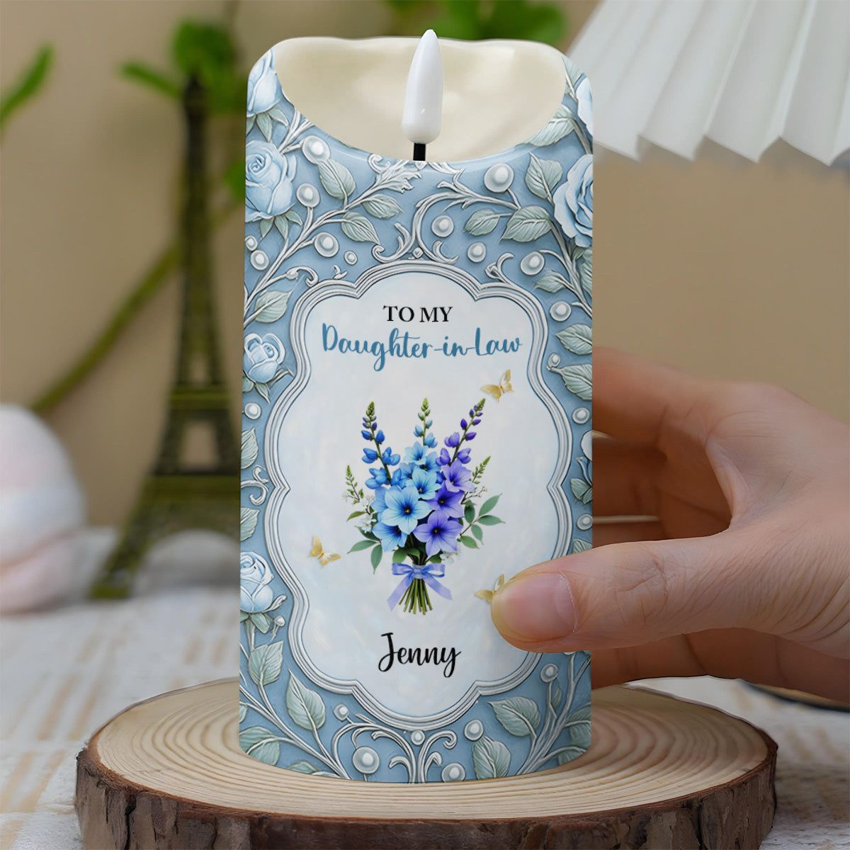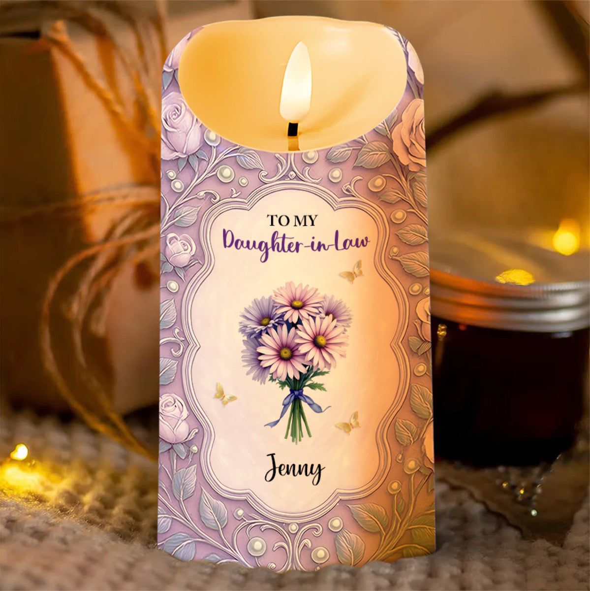 Personalized Flameless LED Candle for Daughter-in-Law, Custom Message & Flowers, Warm Glow Sentimental Gift from Mom