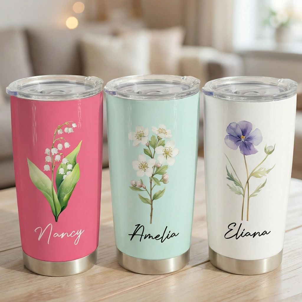 This Insulated Travel Tumbler turns an everyday sip into something personal. Featuring a delicate birth-flower style illustration and a custom name in a clean script, it's an easy, meaningful way to celebrate her without overthinking the gift.