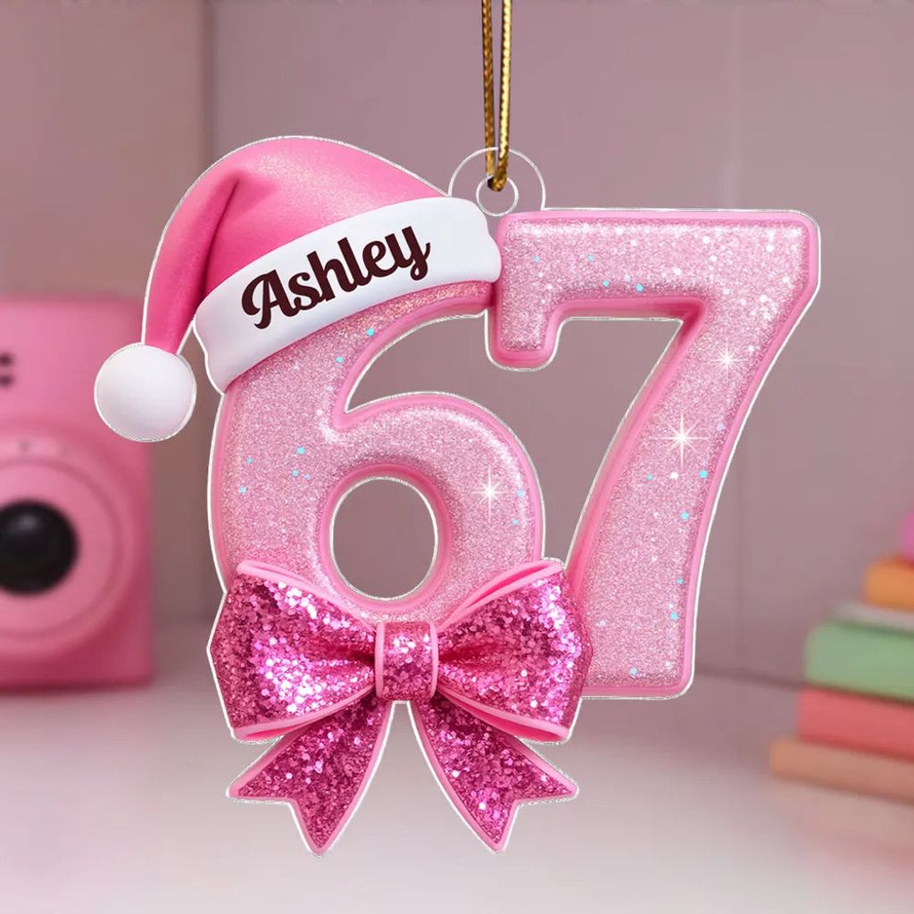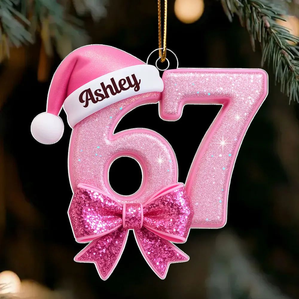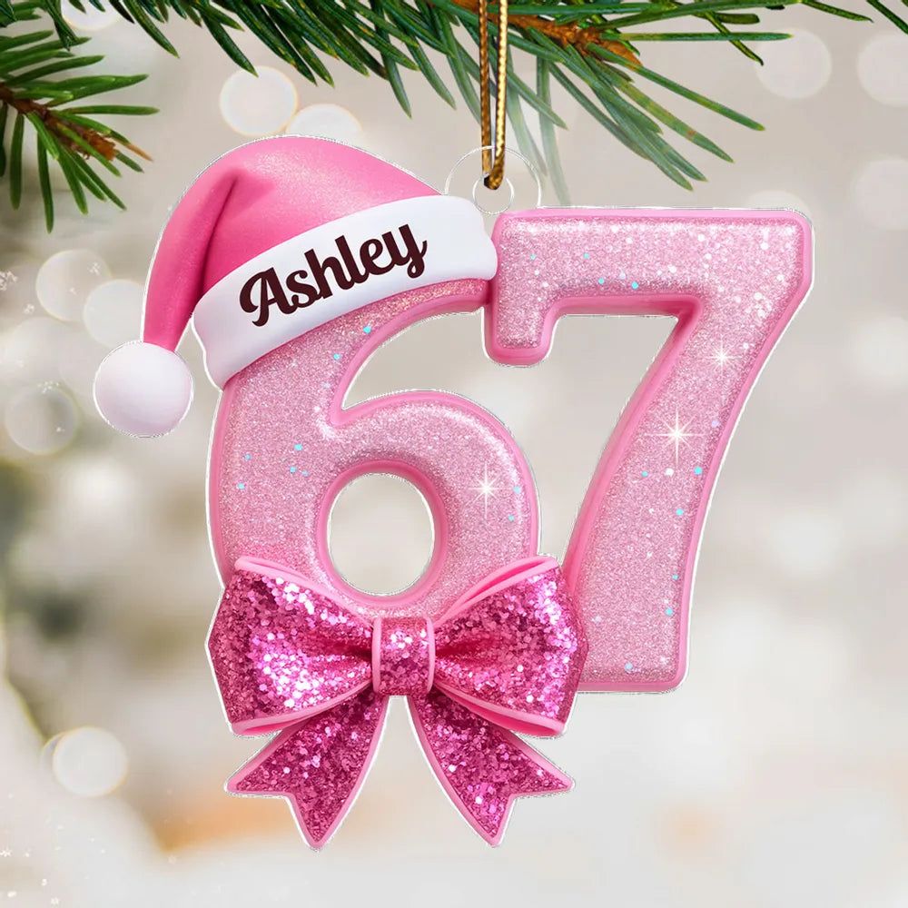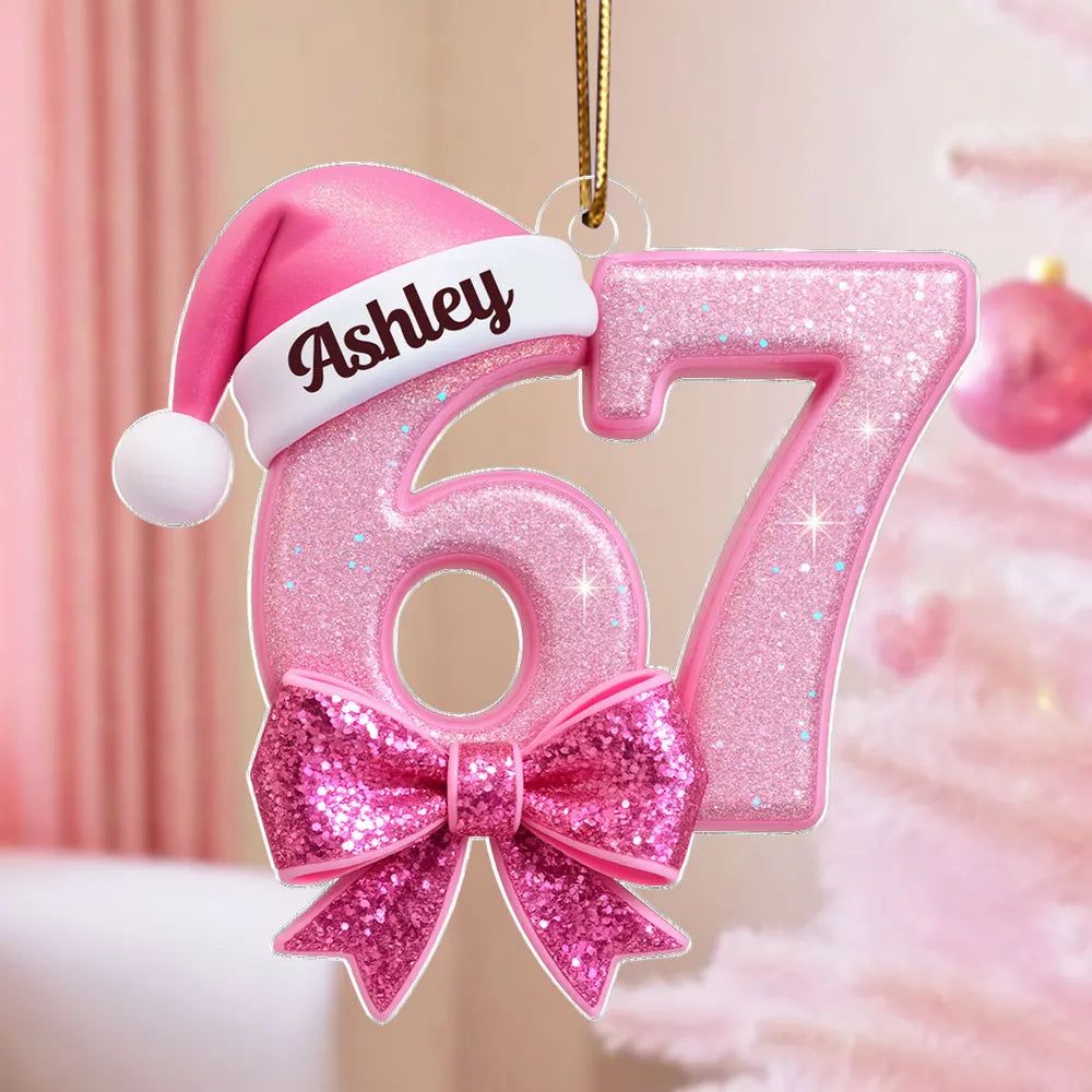 Custom Acrylic Ornament in Pink Glitter Number Style, Festive Santa Hat & Big Bow, Sweet Holiday Keepsake Gift for Grandkids