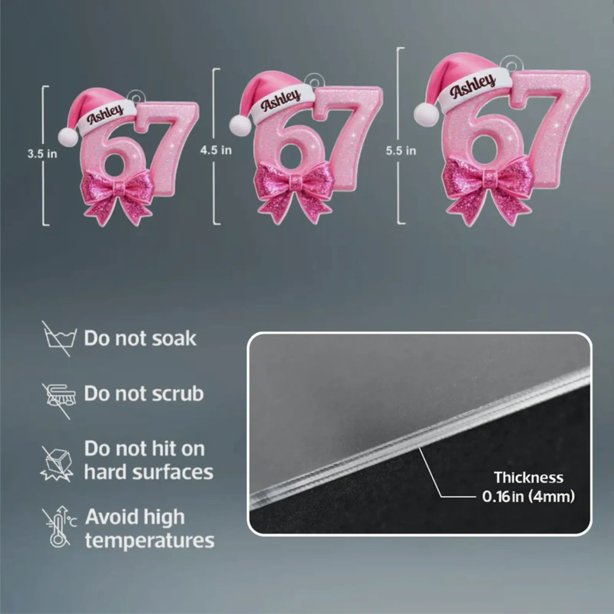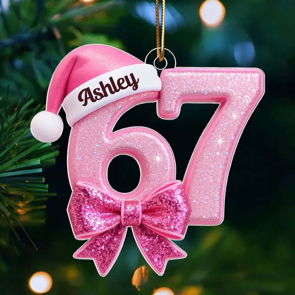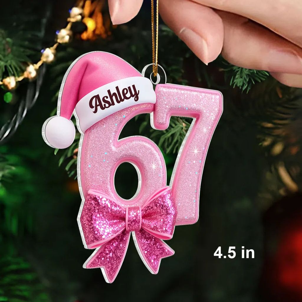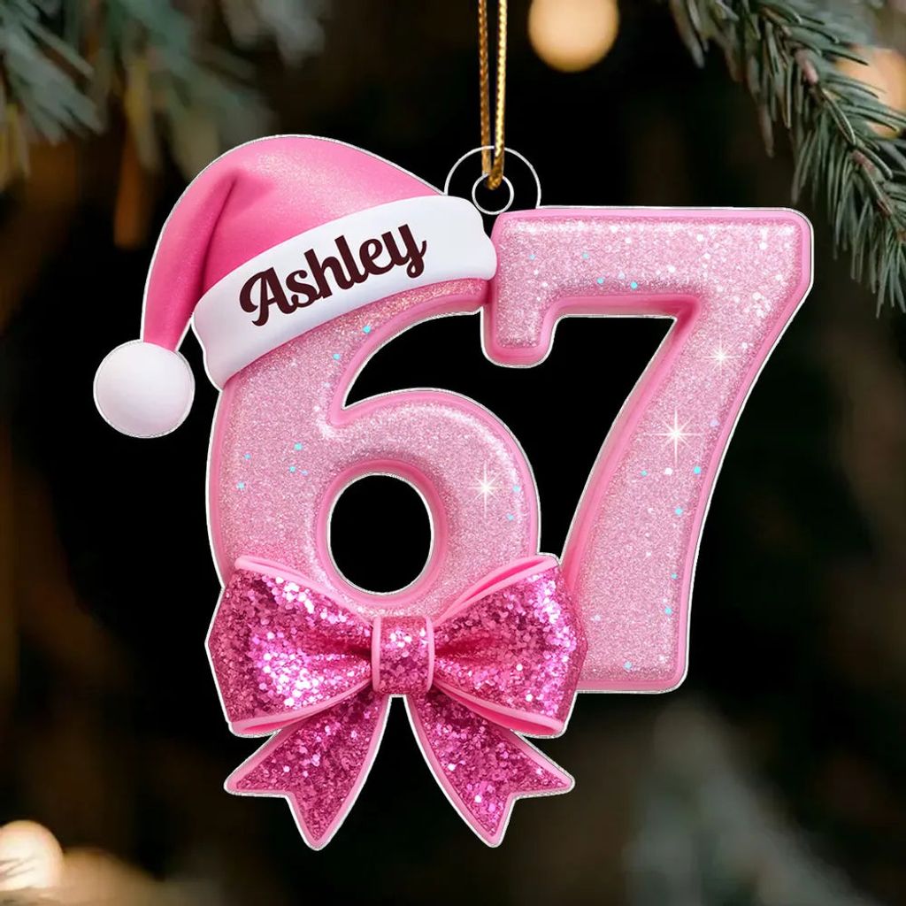 Custom Acrylic Ornament in Pink Glitter Number Style, Festive Santa Hat & Big Bow, Sweet Holiday Keepsake Gift for Grandkids