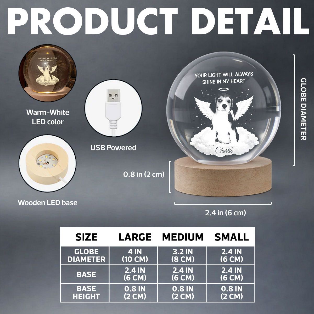 - Material: K5 crystal globe, wooden base, LED light & string