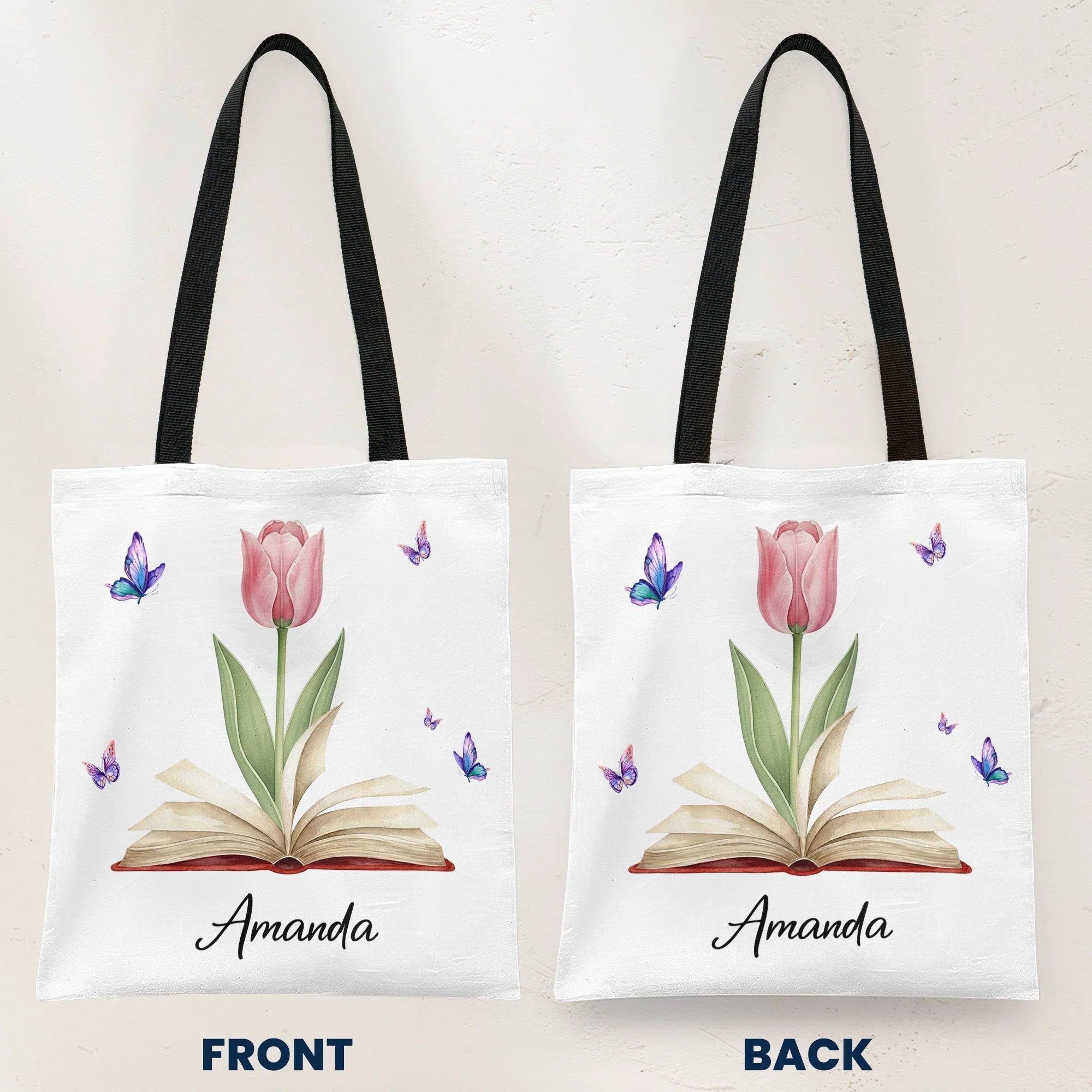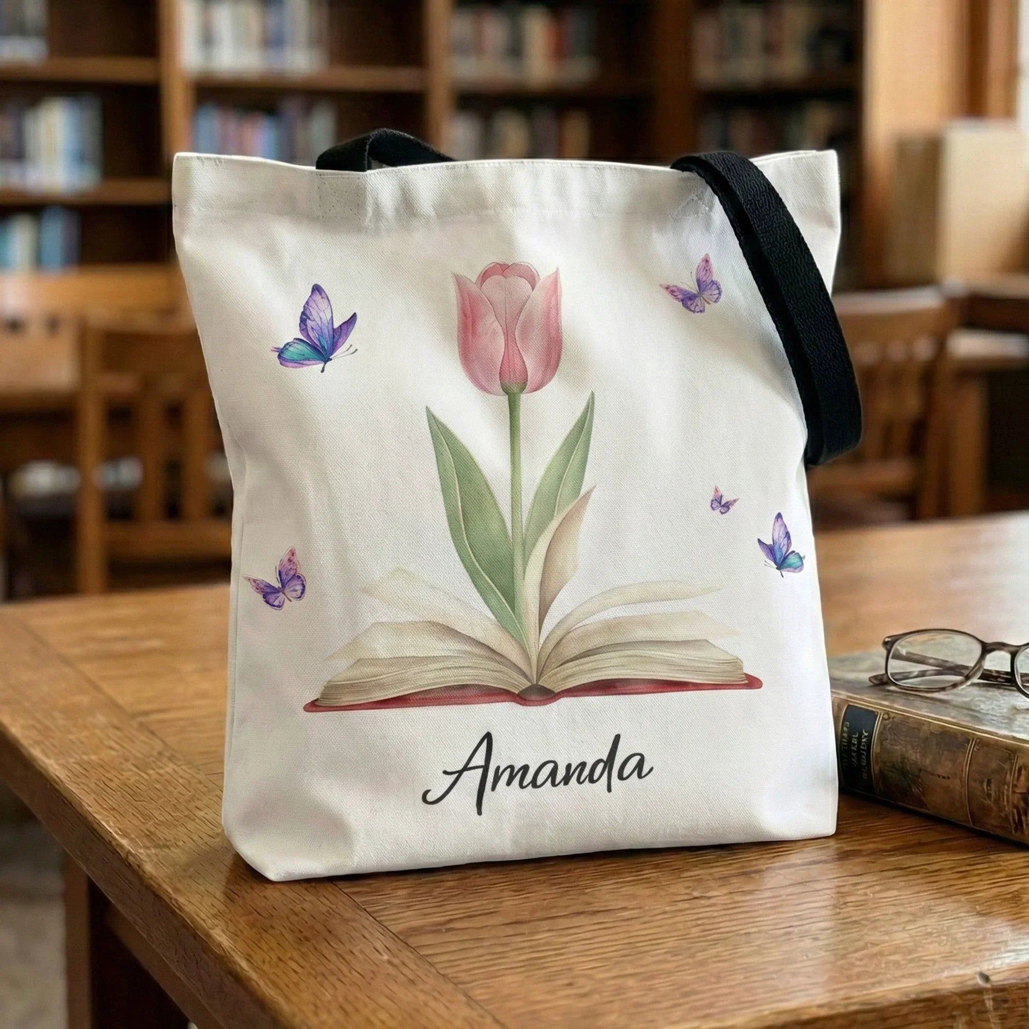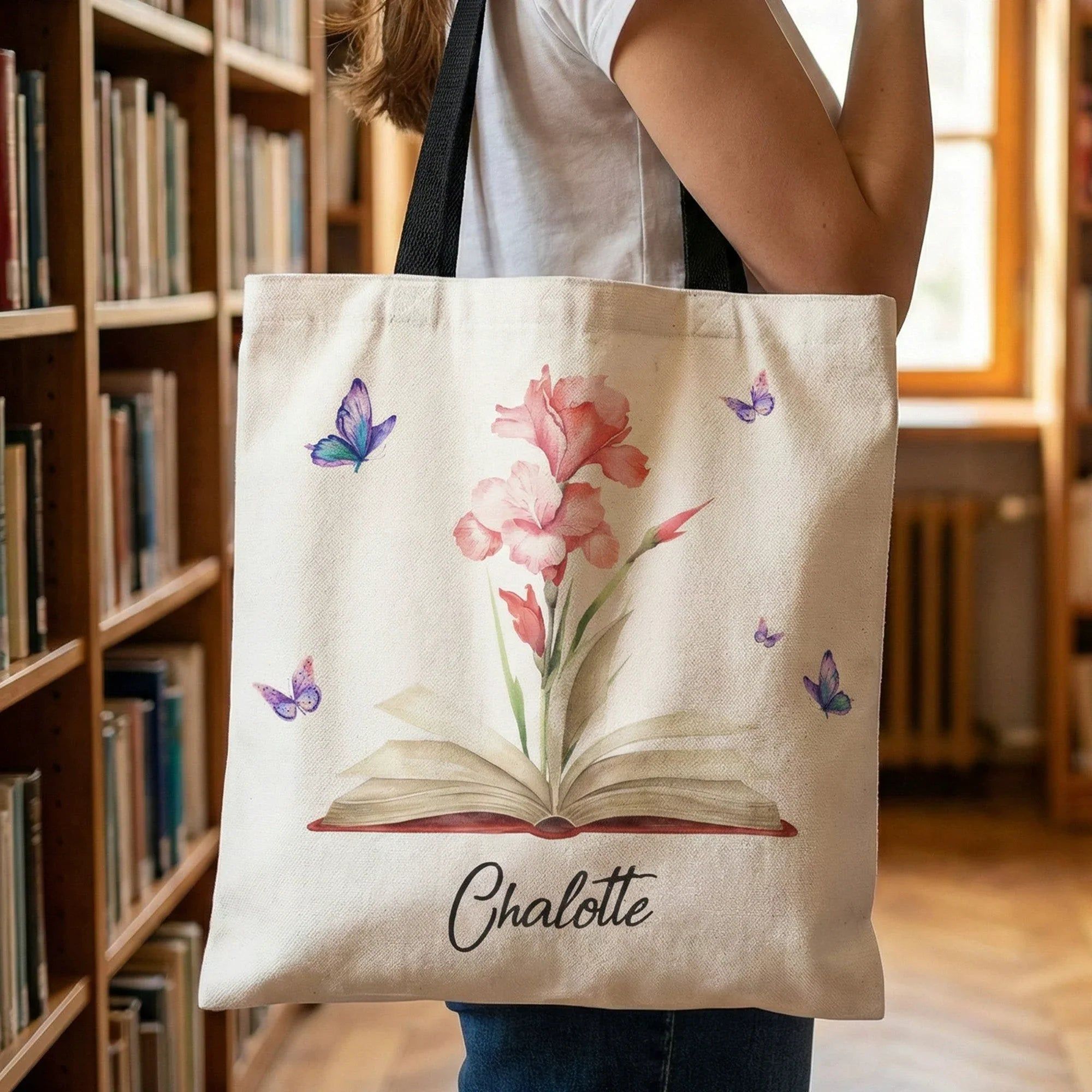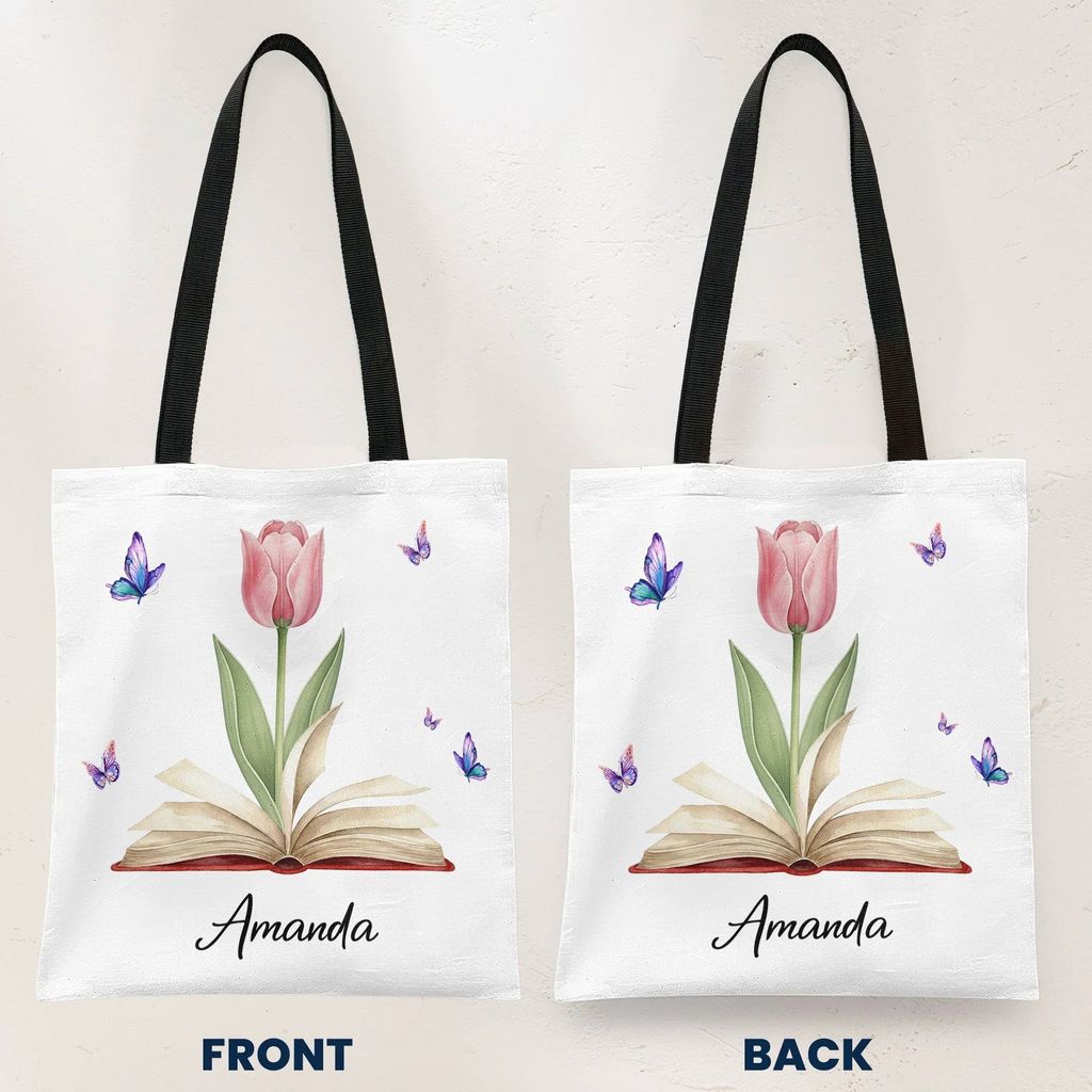 Personalized Tote Bag with Birth Flower Book Design, Butterfly Accent, Unique Gift for Book Lovers and Book Club Friends