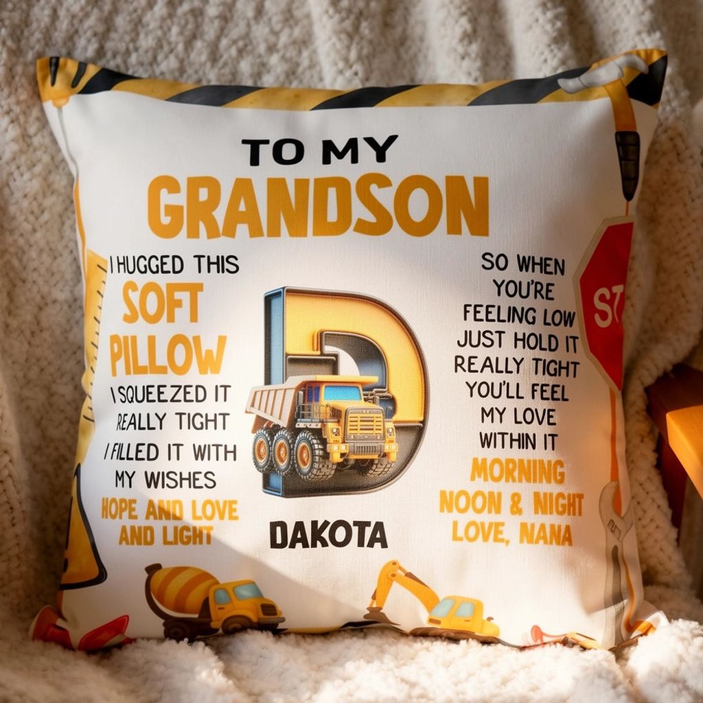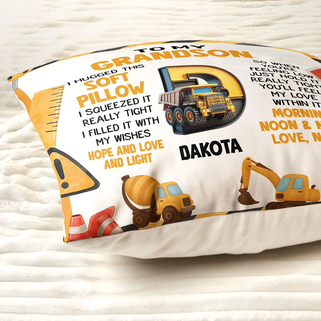 Personalized Construction Theme Square Pillow for Grandson, Cute Truck Initial Design, Unique Gift That Feels Like a Hug