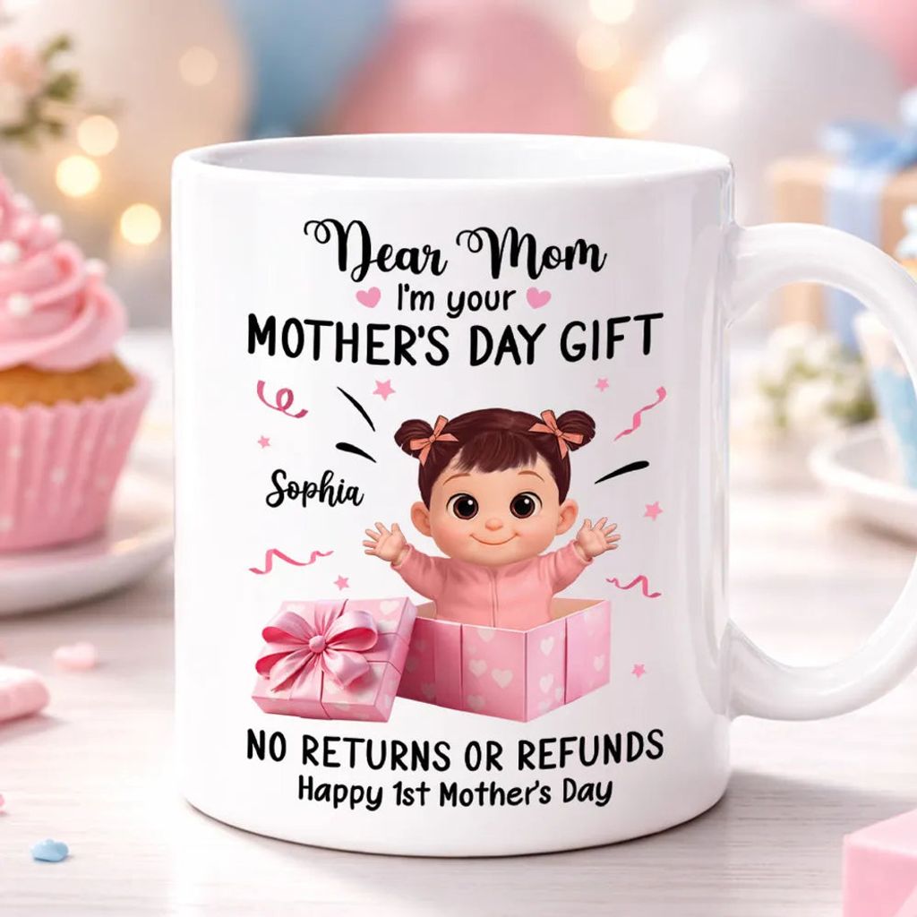 The design reads 'Dear Mom I'm your MOTHER'S DAY GIFT' with a cute cartoon baby popping out of a pink gift box, plus 'Happy 1st Mother's Day'. It's playful, heartwarming, and looks adorable on any counter.