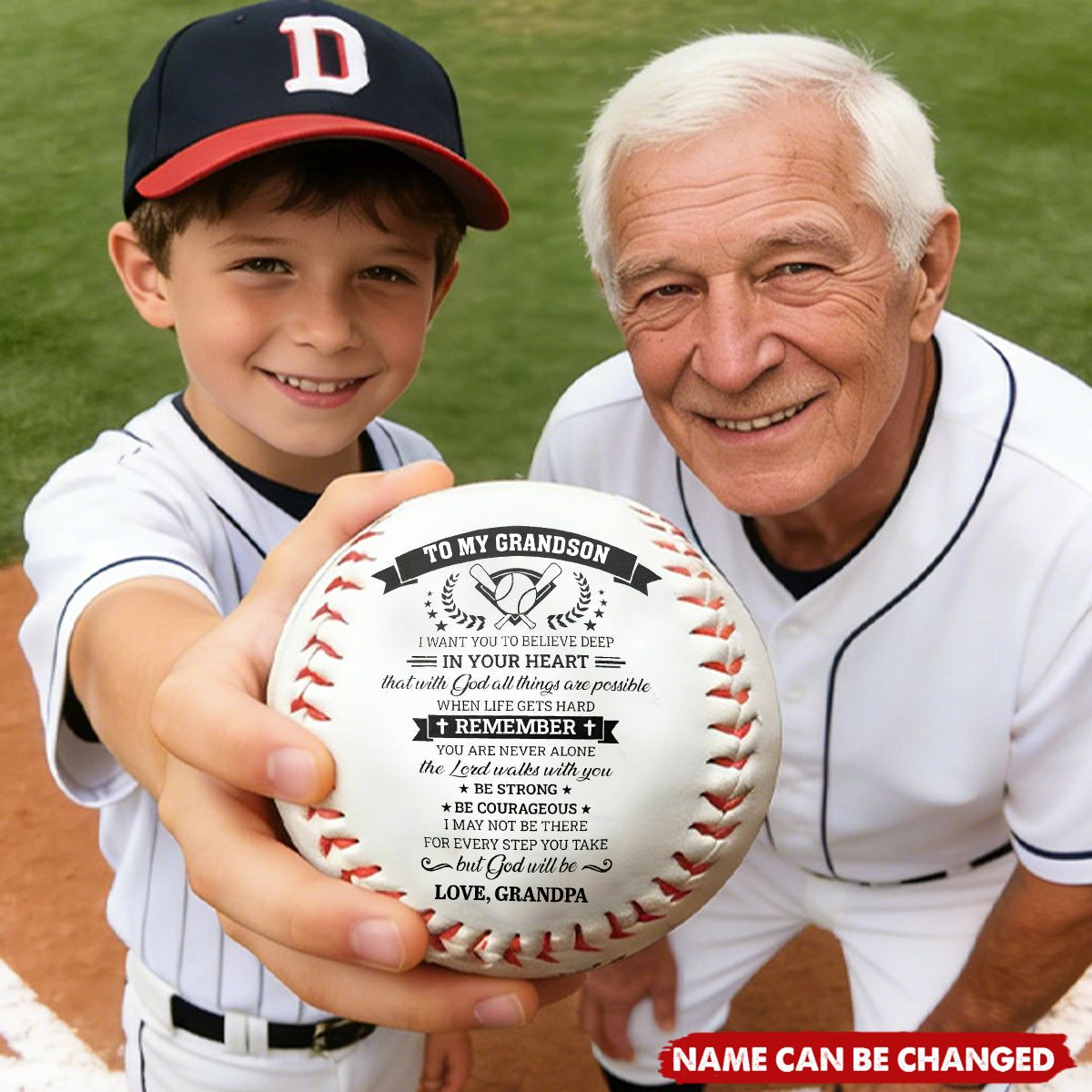 The design feels like a sunny day at the ballpark, featuring a heartfelt note from Grandpa that reminds him to be strong, be courageous, and never feel alone.