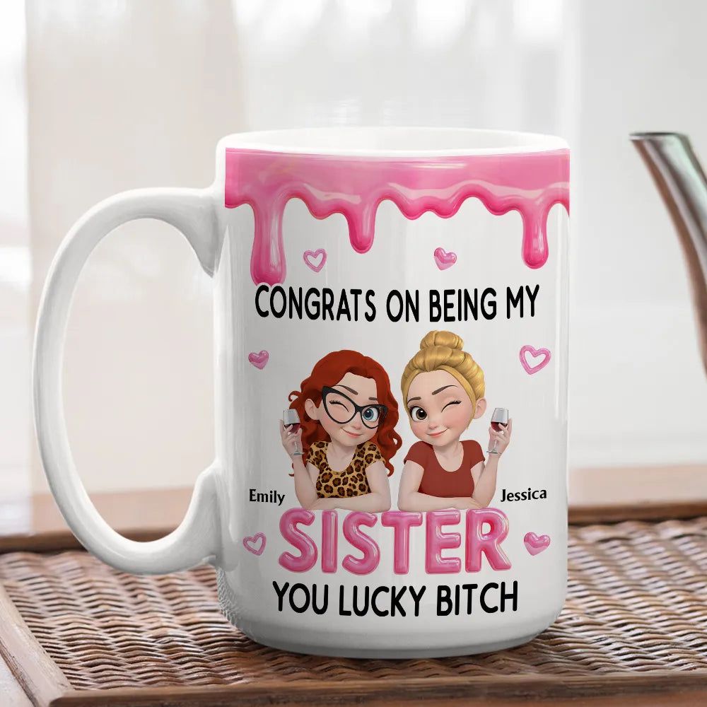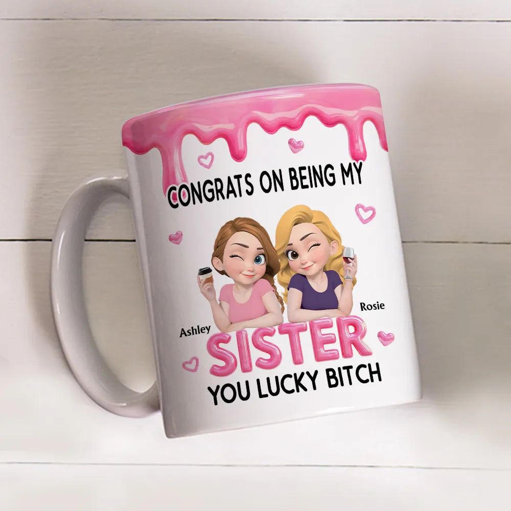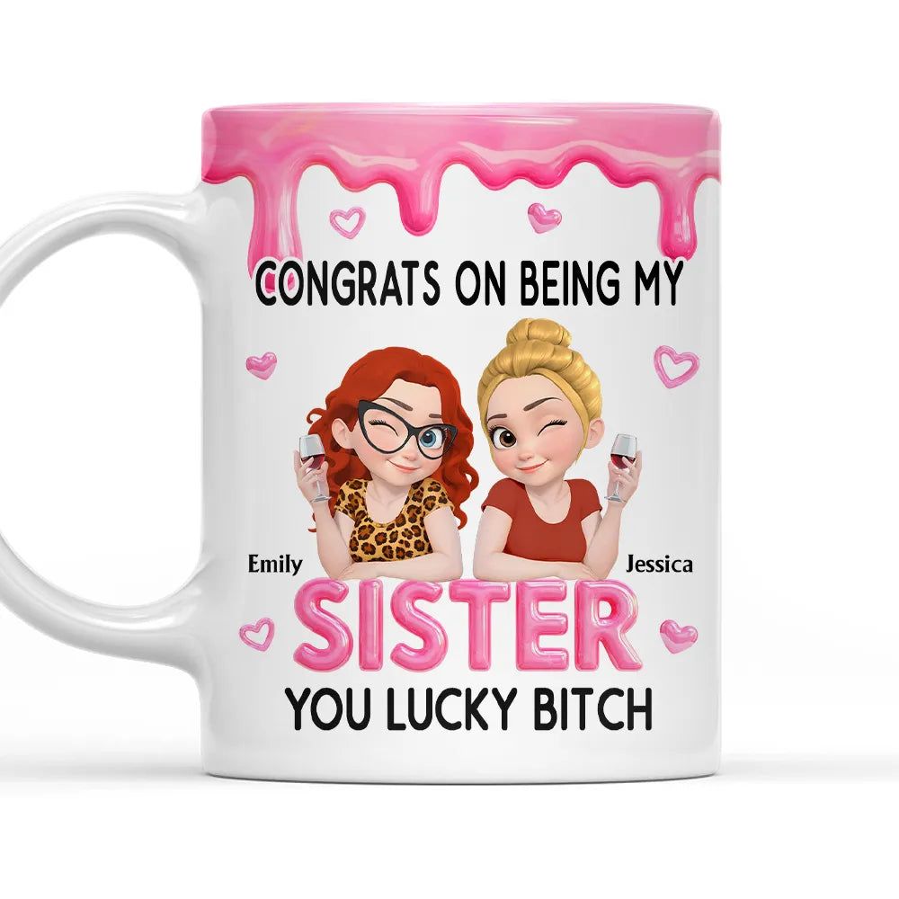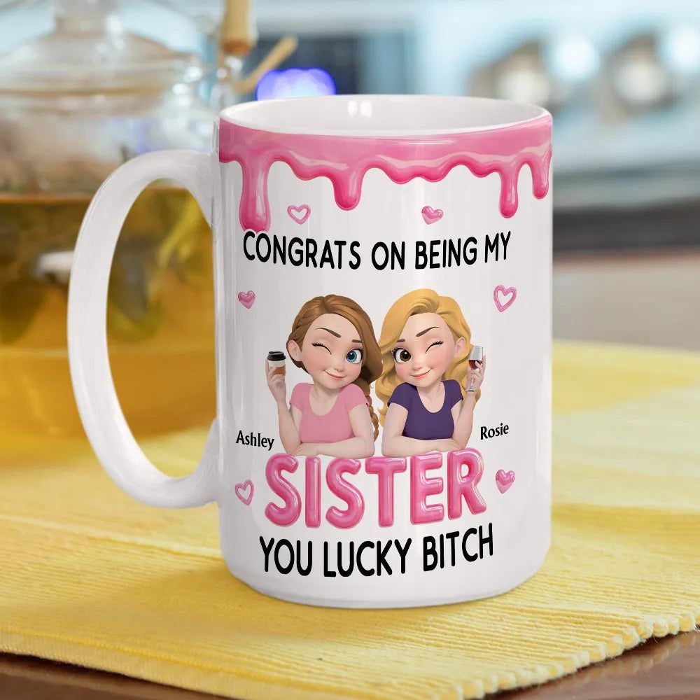 Personalized Sister Ceramic Mug with Funny Congrats Quote, Cute Cartoon Toast Design, Unique Gift for Your Sister