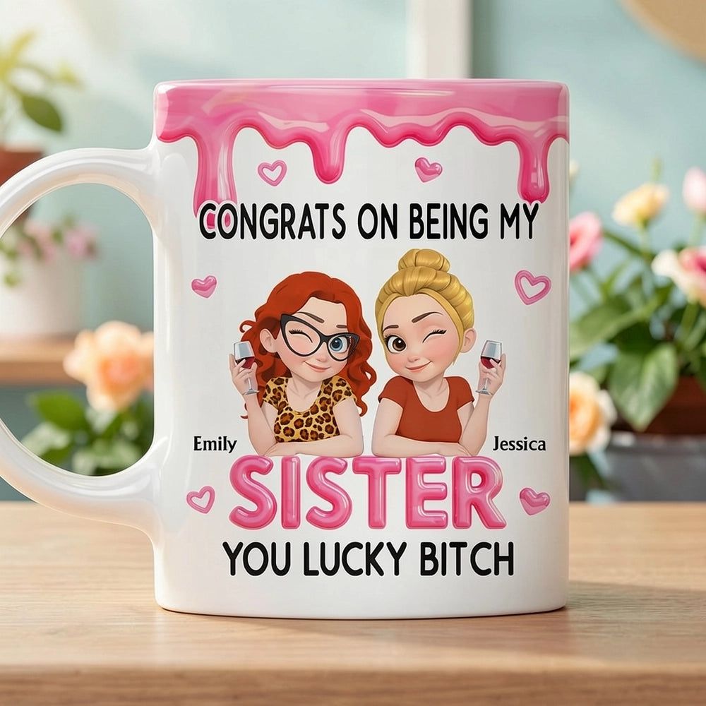 With pink drip details, little hearts, and a cheeky sister message, it is made for morning coffee or daily tea and guaranteed to get a laugh. It looks adorable on a desk or kitchen counter.