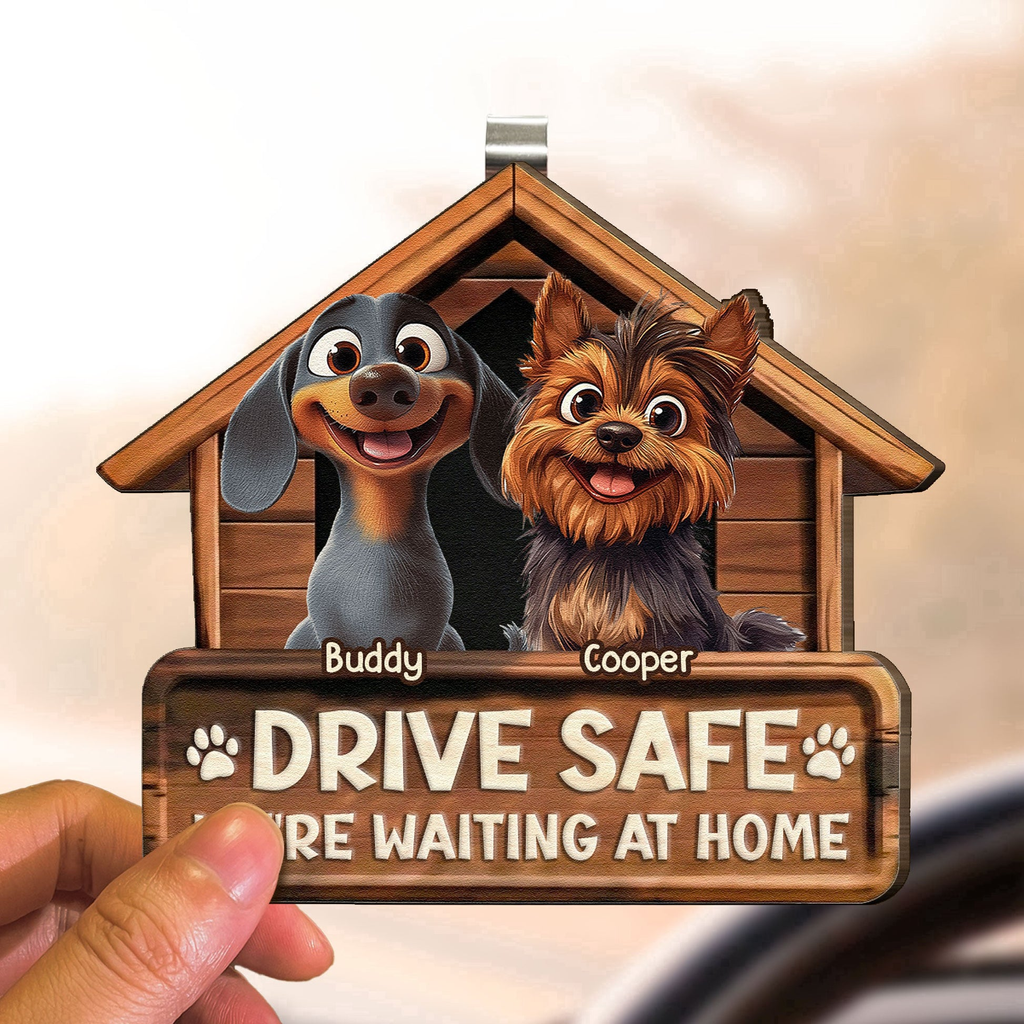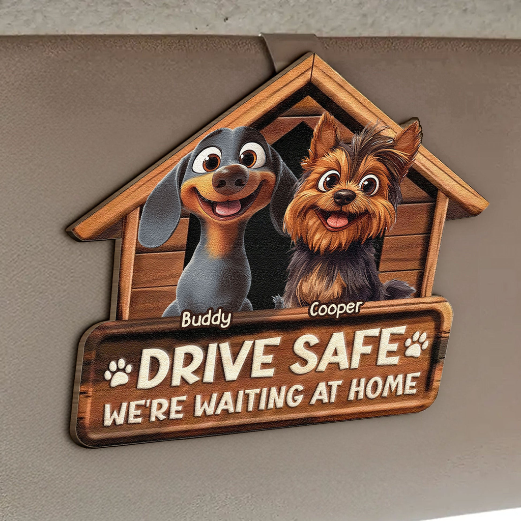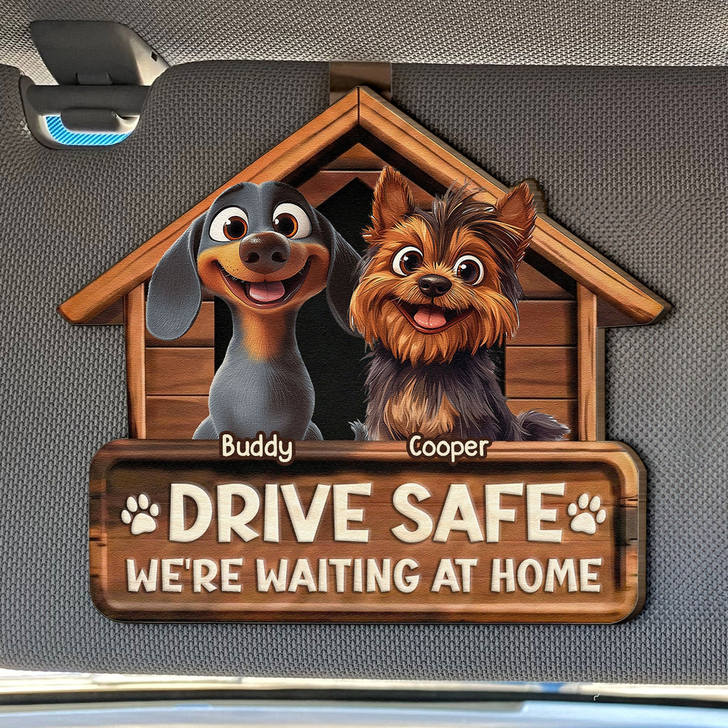 Personalized Wooden Car Visor Clip with Cute Dogs and 'Drive Safe We're Waiting At Home' Unique Gift for Pet Owners