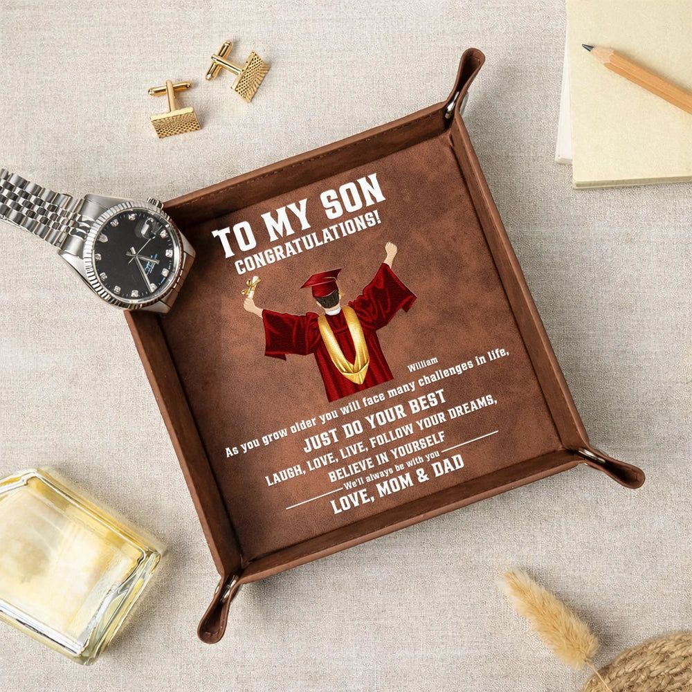 Leather Valet Tray With Graduation Cap Art and Encouraging Quote, Desk and Dresser Organizer, Unique Gift for Son