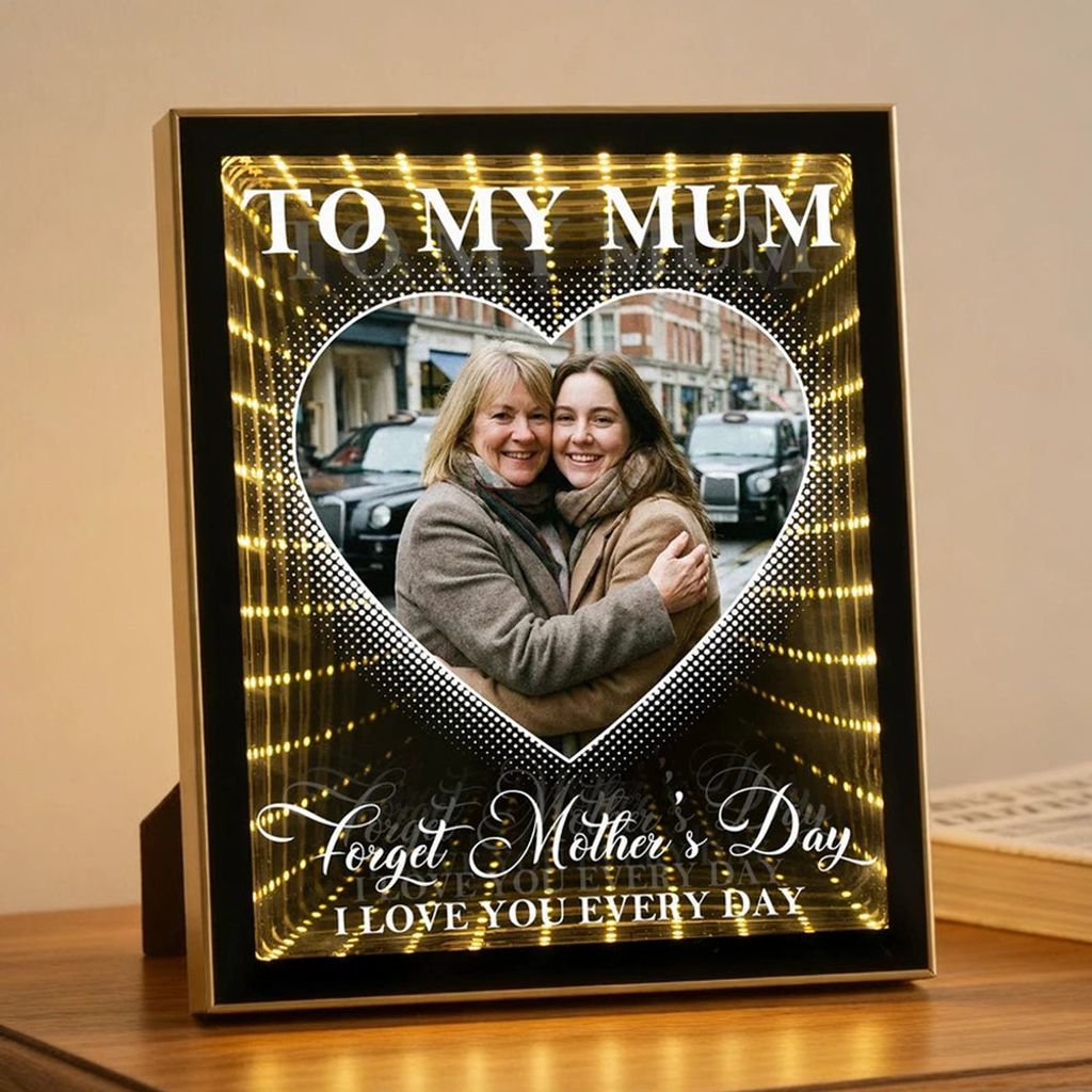 Designed with a heart-shaped photo window and warm golden LEDs, this piece creates a dreamy infinity depth that draws the eye in. The sample design features a cozy hug moment and the sentiment "I love you every day," giving it that tender, everyday-love feel that fits beautifully on a nightstand, shelf, or entry table.