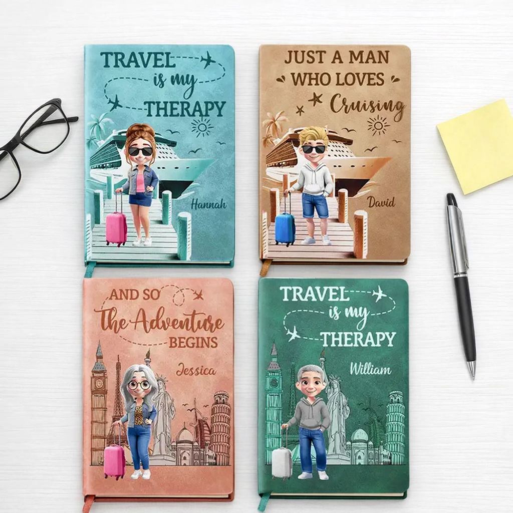 The cover features a cute cartoon traveler with luggage and iconic travel scenery, plus phrases like 'Travel is my therapy' and 'And so the adventure begins'. It looks amazing on a desk or nightstand.