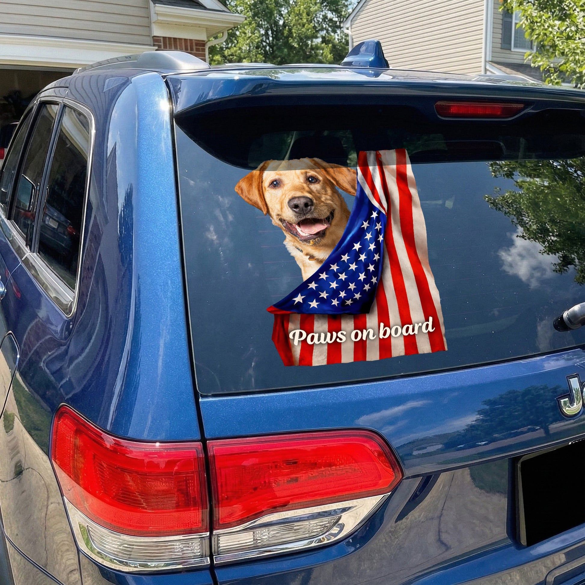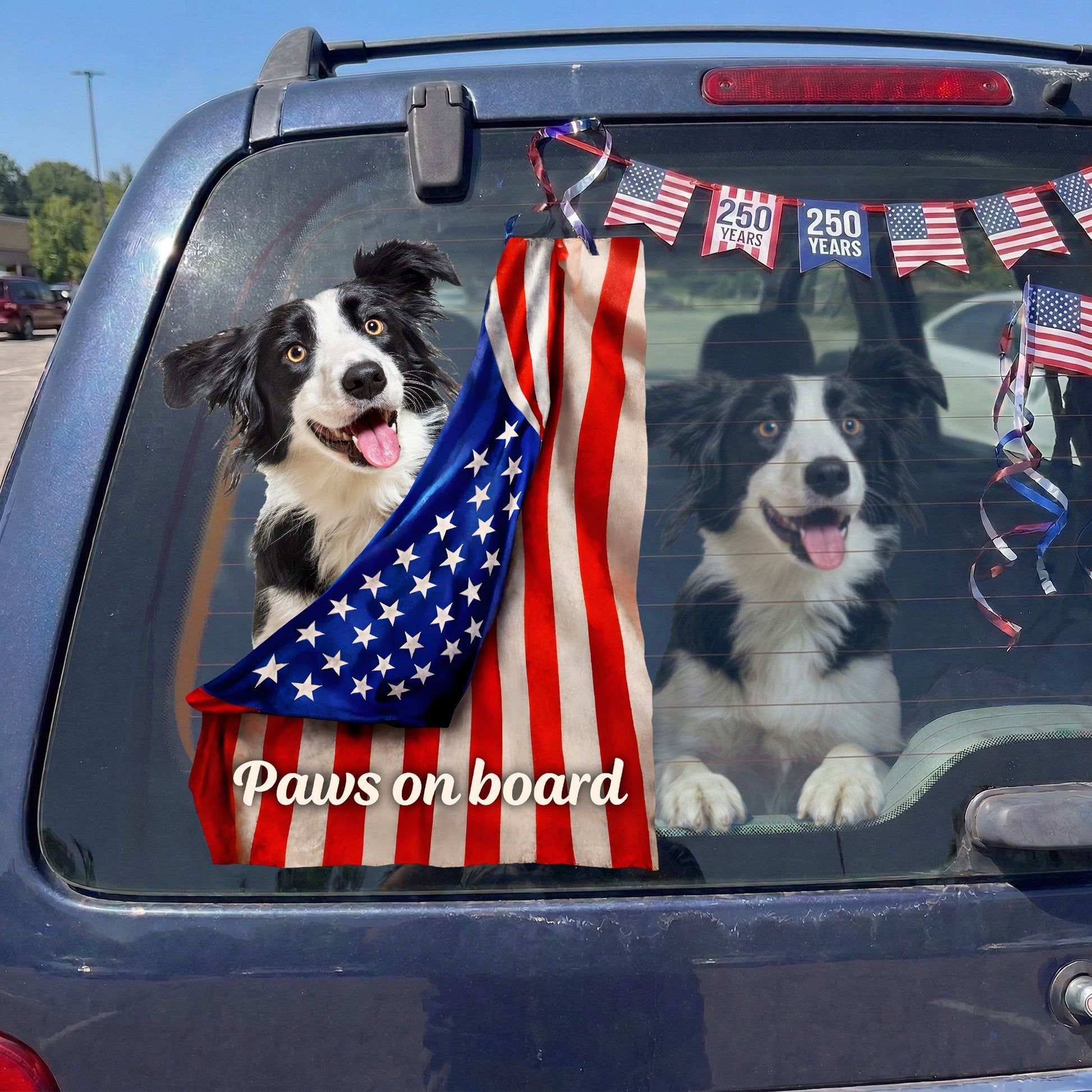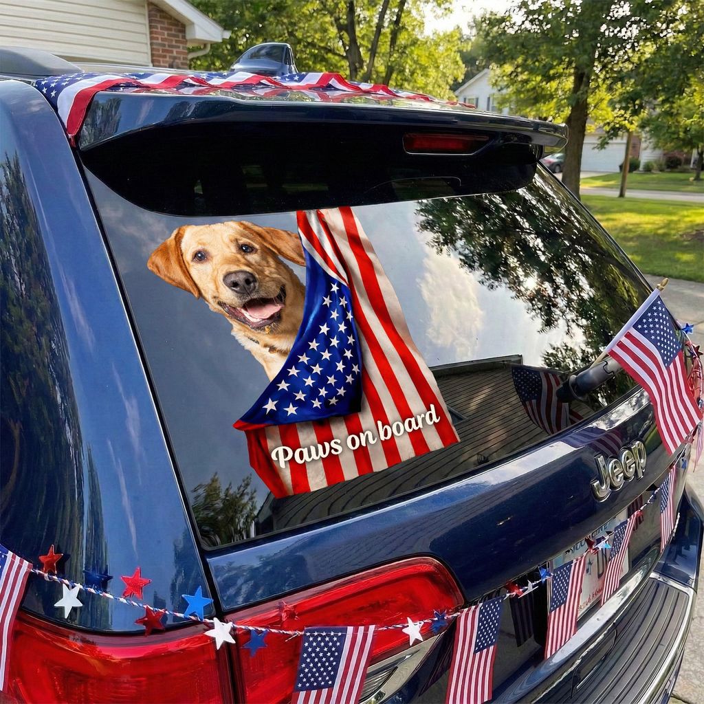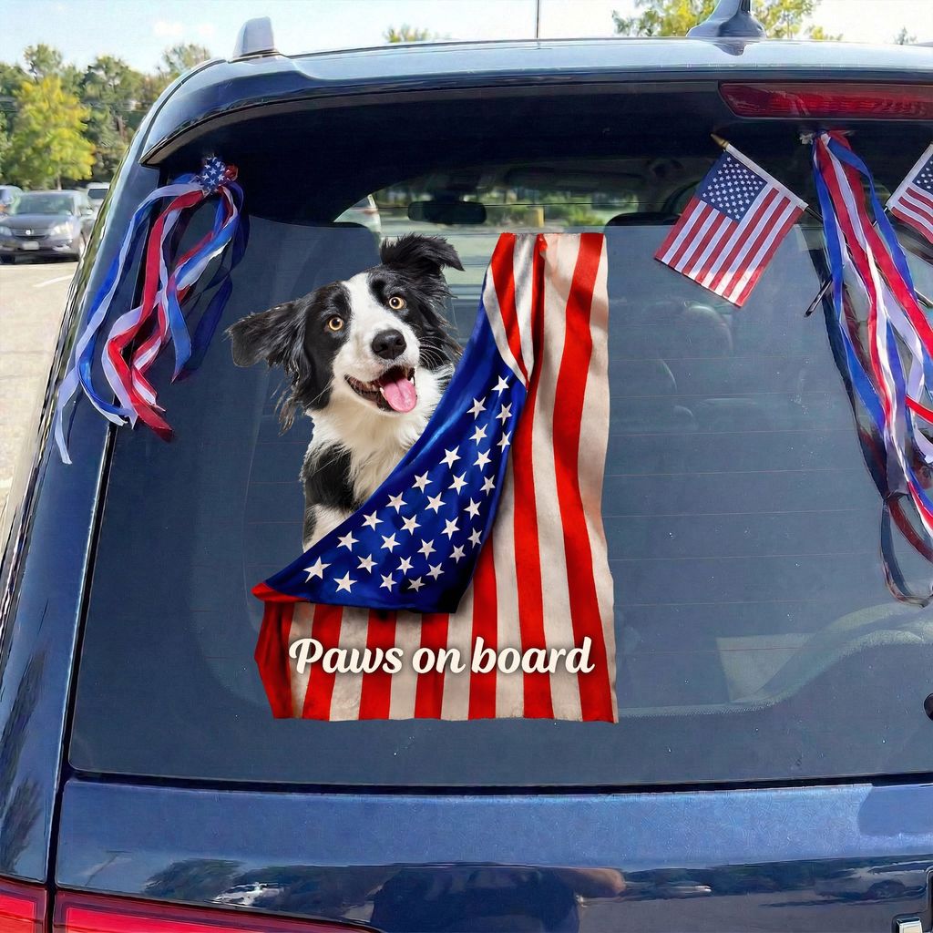 The design features an adorable black and white dog with a patriotic flag vibe and the phrase 'Paws on board'. It adds a colorful, high energy upgrade to your rear window or any smooth spot.