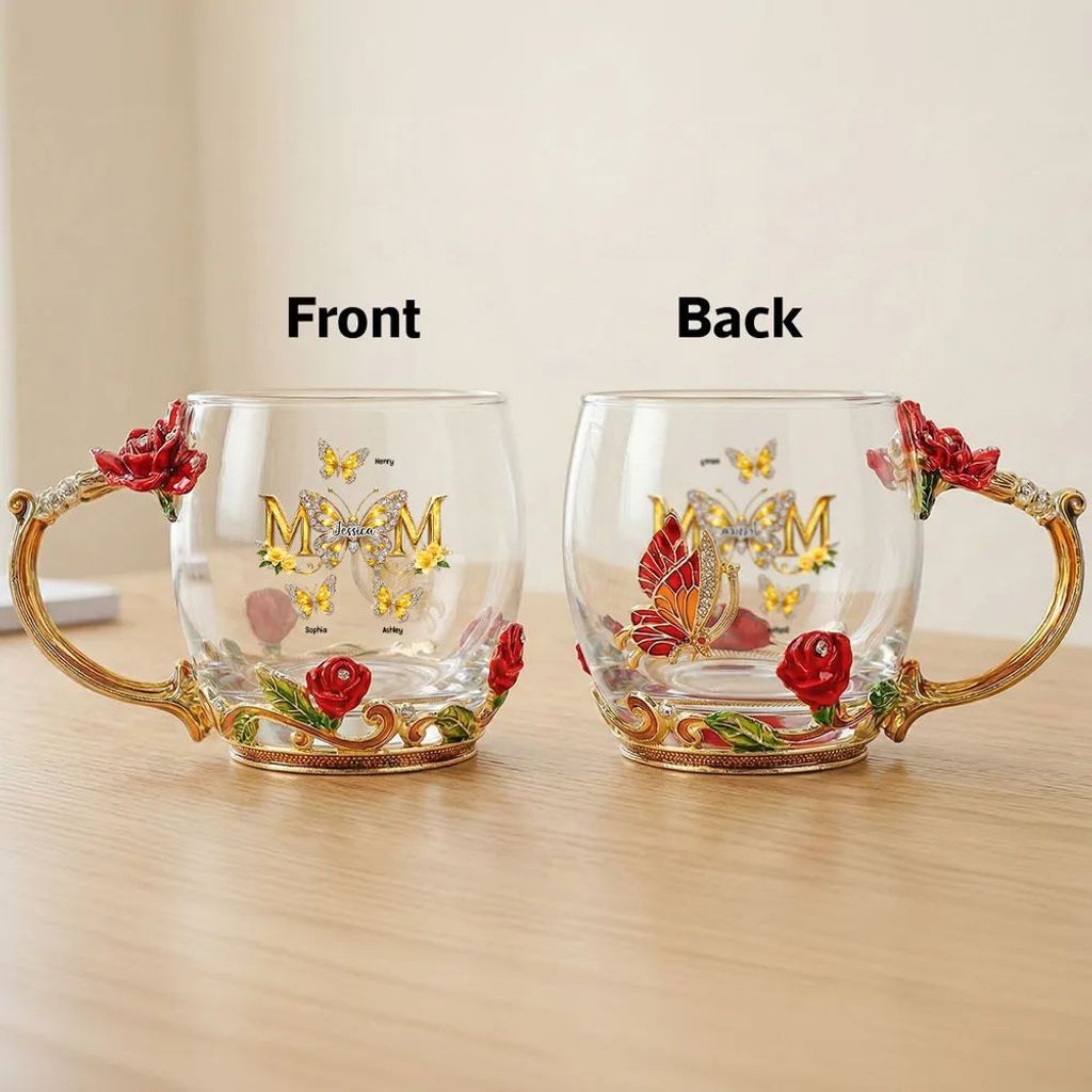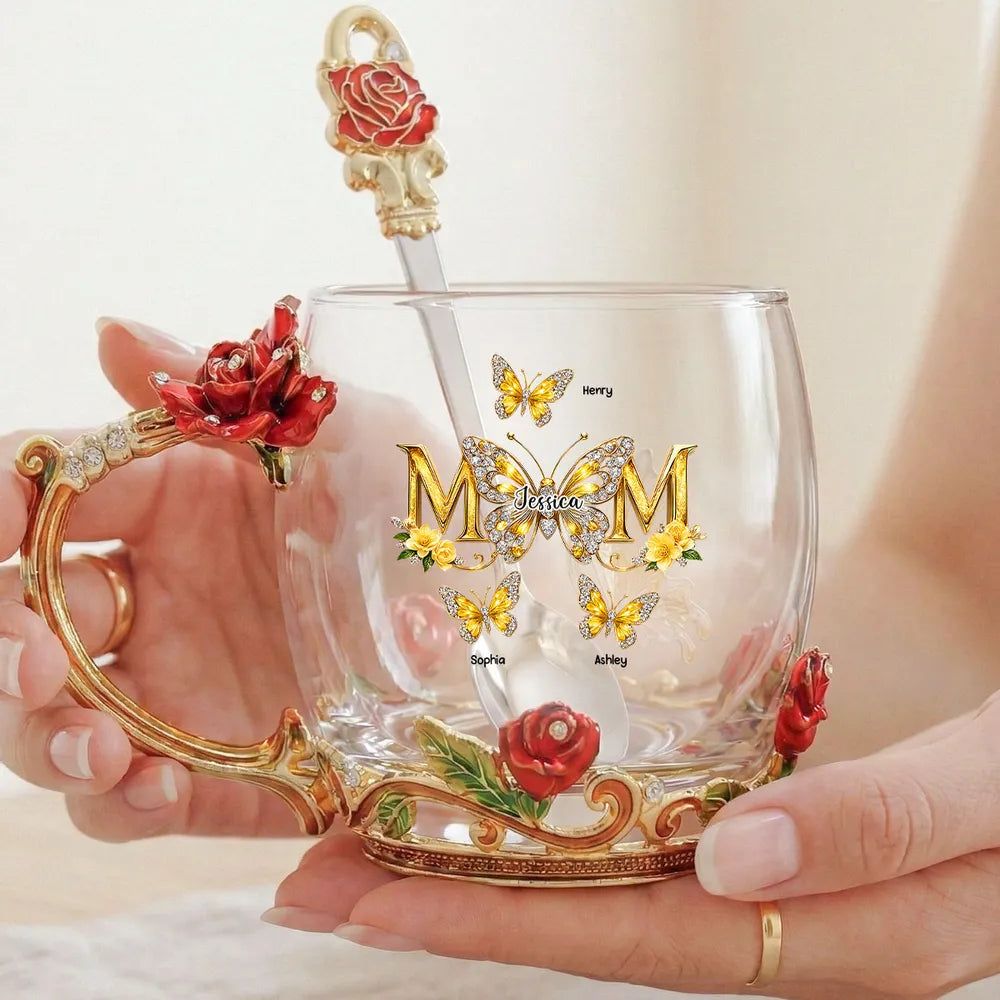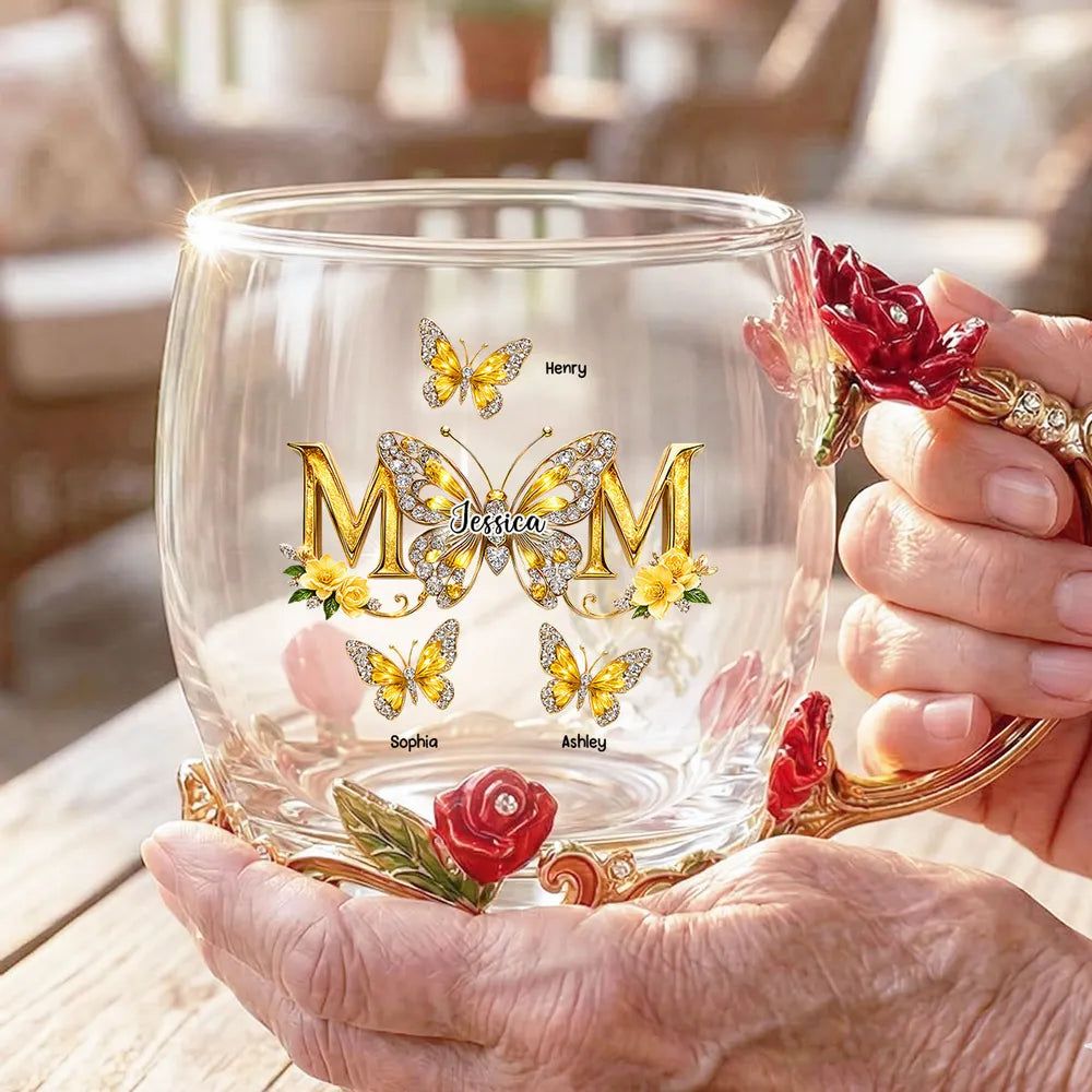 Personalized Enamel Flower Tea Cup with Butterfly Mom Monogram, Unique Gift for Mom, Warm Everyday Tea Moment