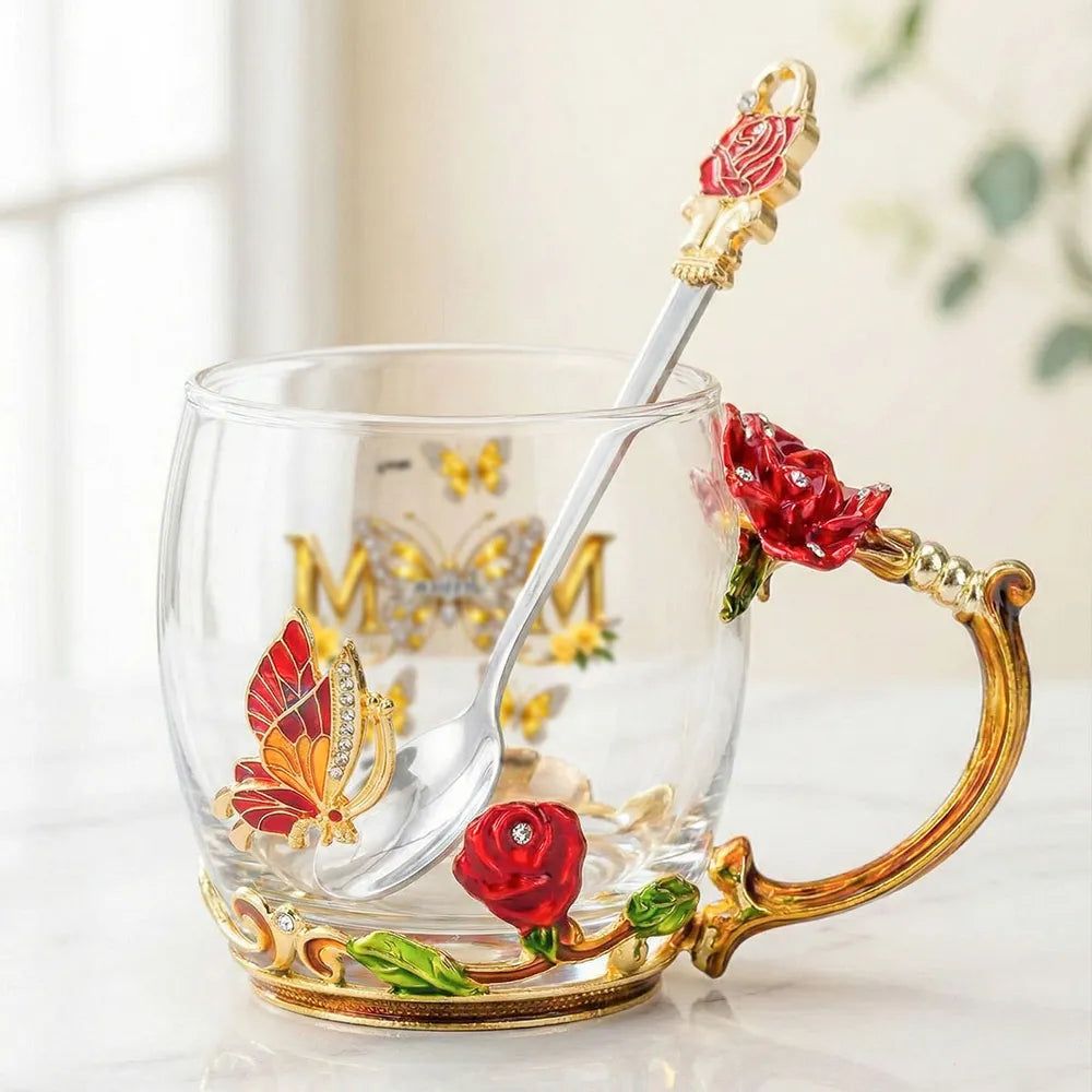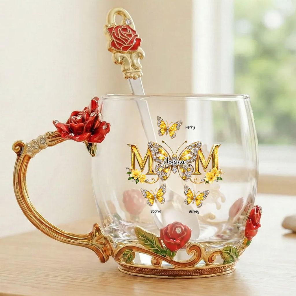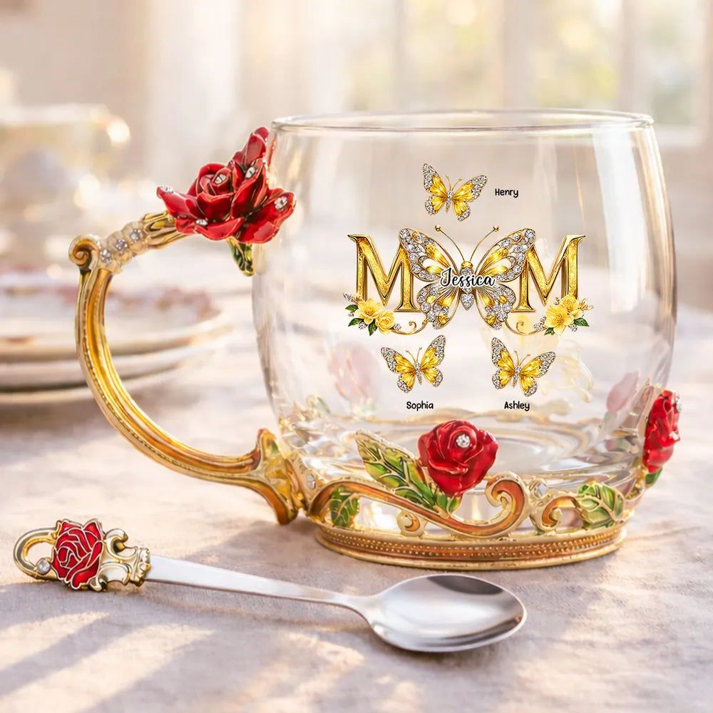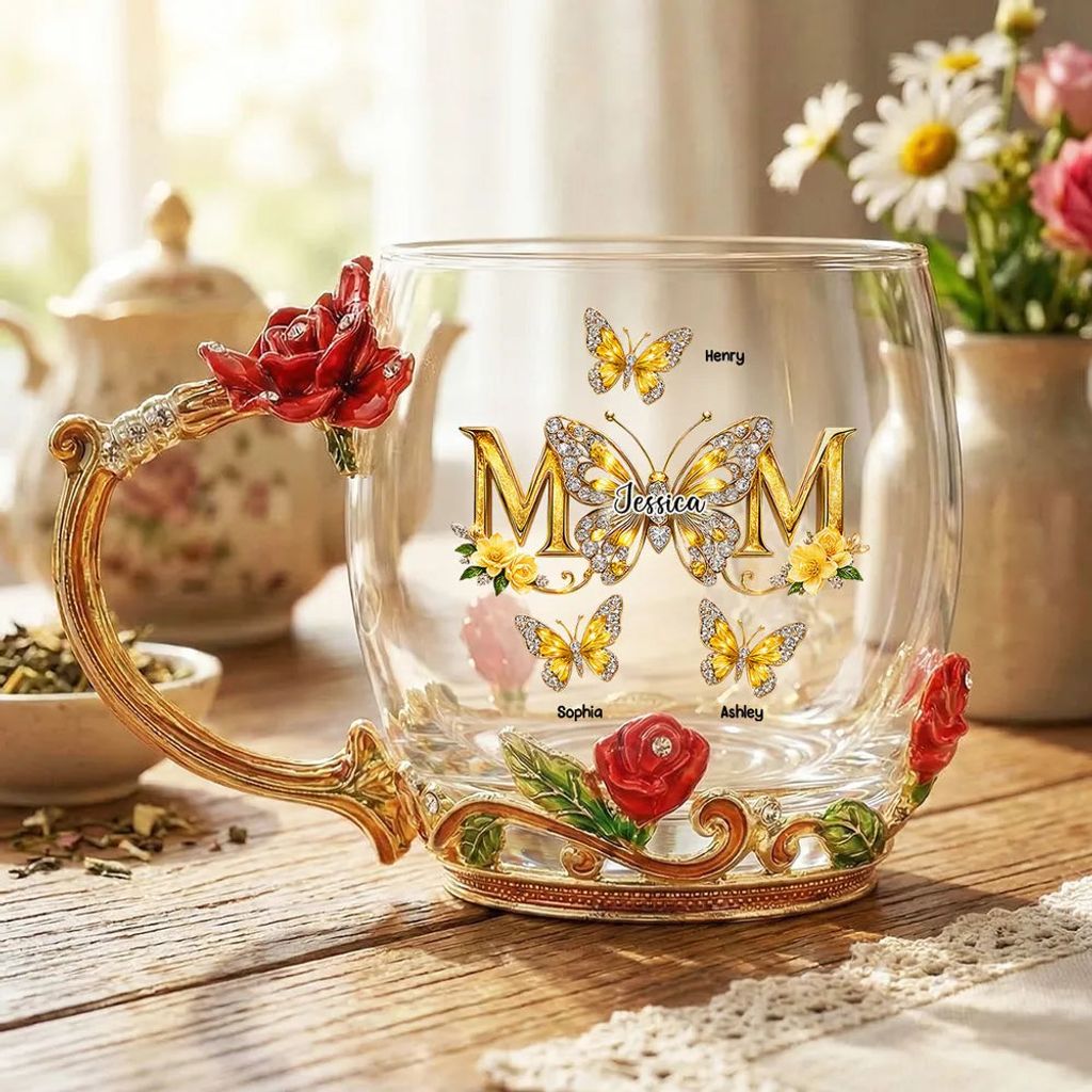 Personalized Enamel Flower Tea Cup with Butterfly Mom Monogram, Unique Gift for Mom, Warm Everyday Tea Moment