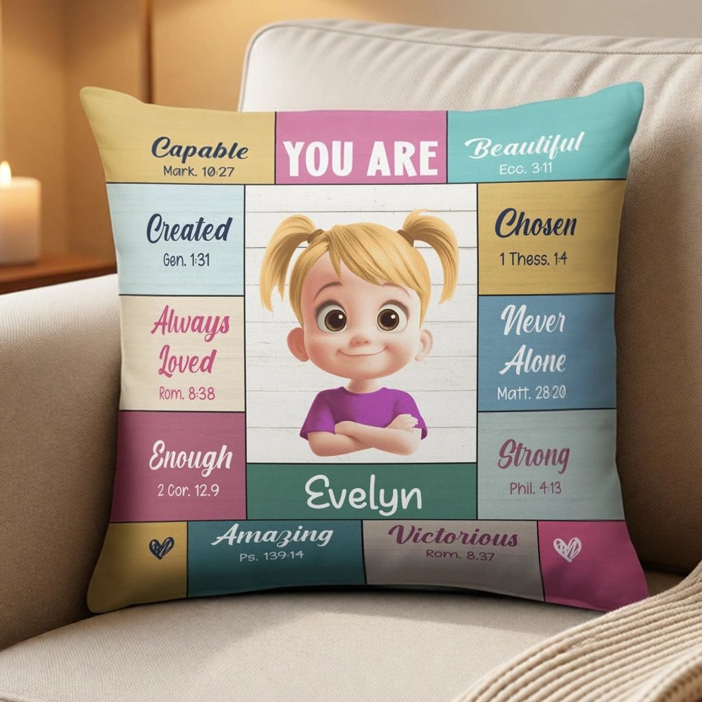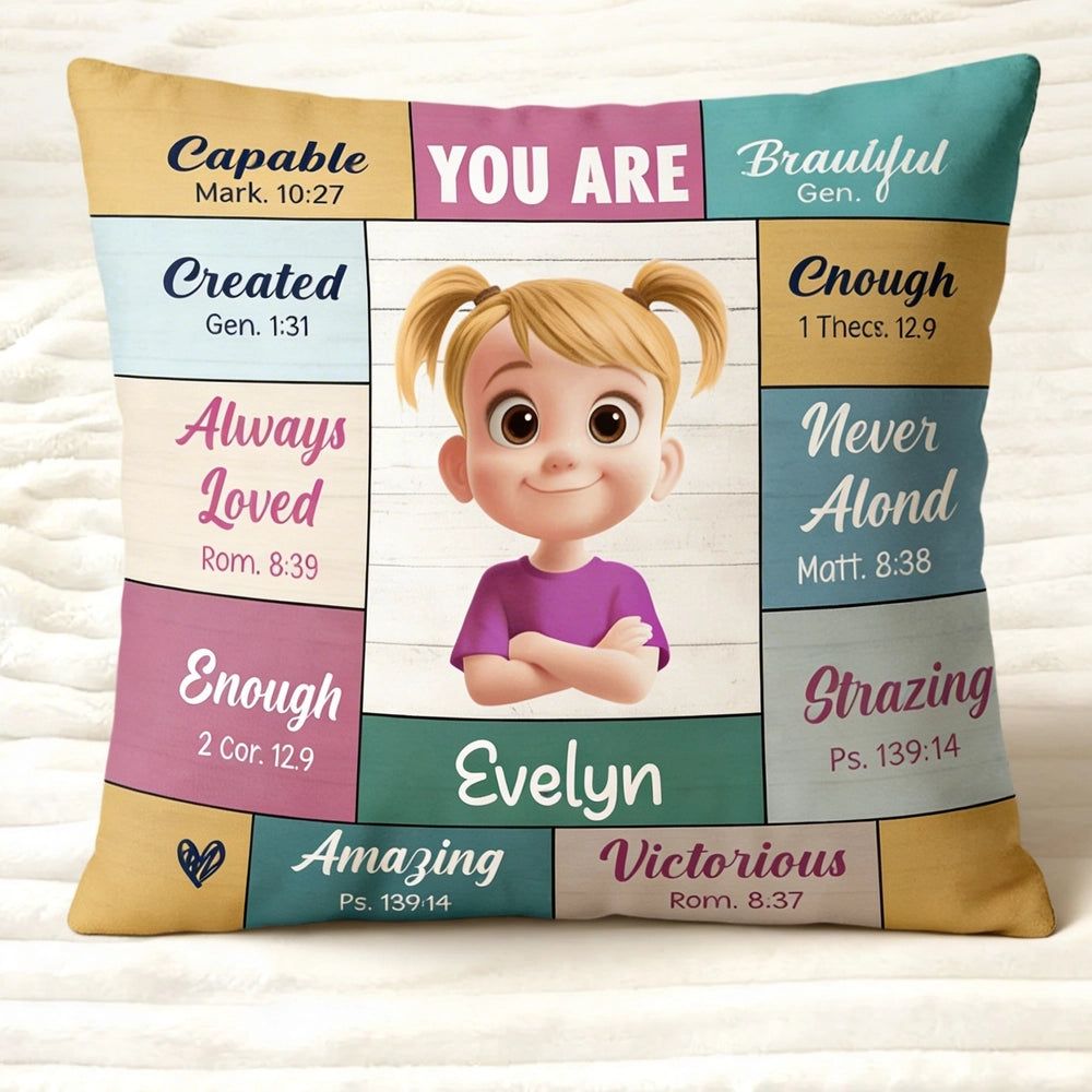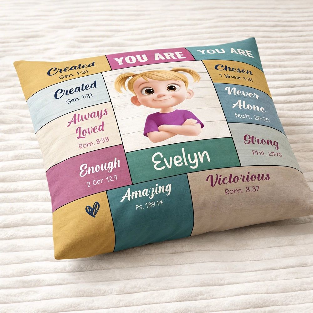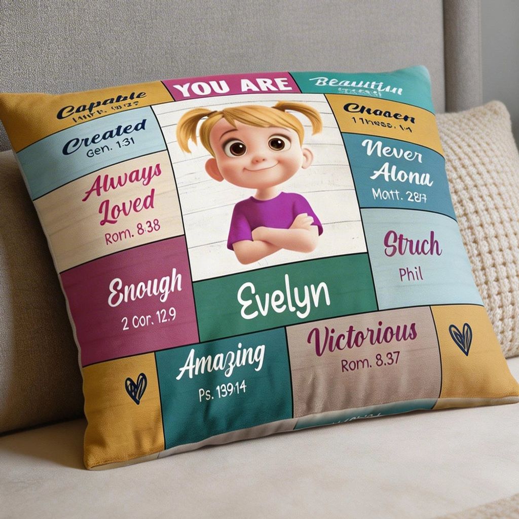 Square Pillow with 'You Are' Bible Verse Affirmations, Bright Pastel Nursery Accent, Thoughtful Personalized Gift for Kids