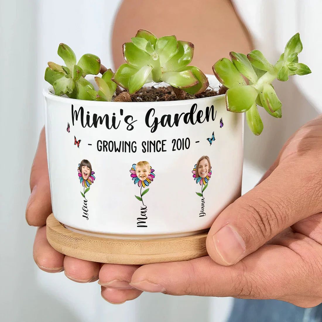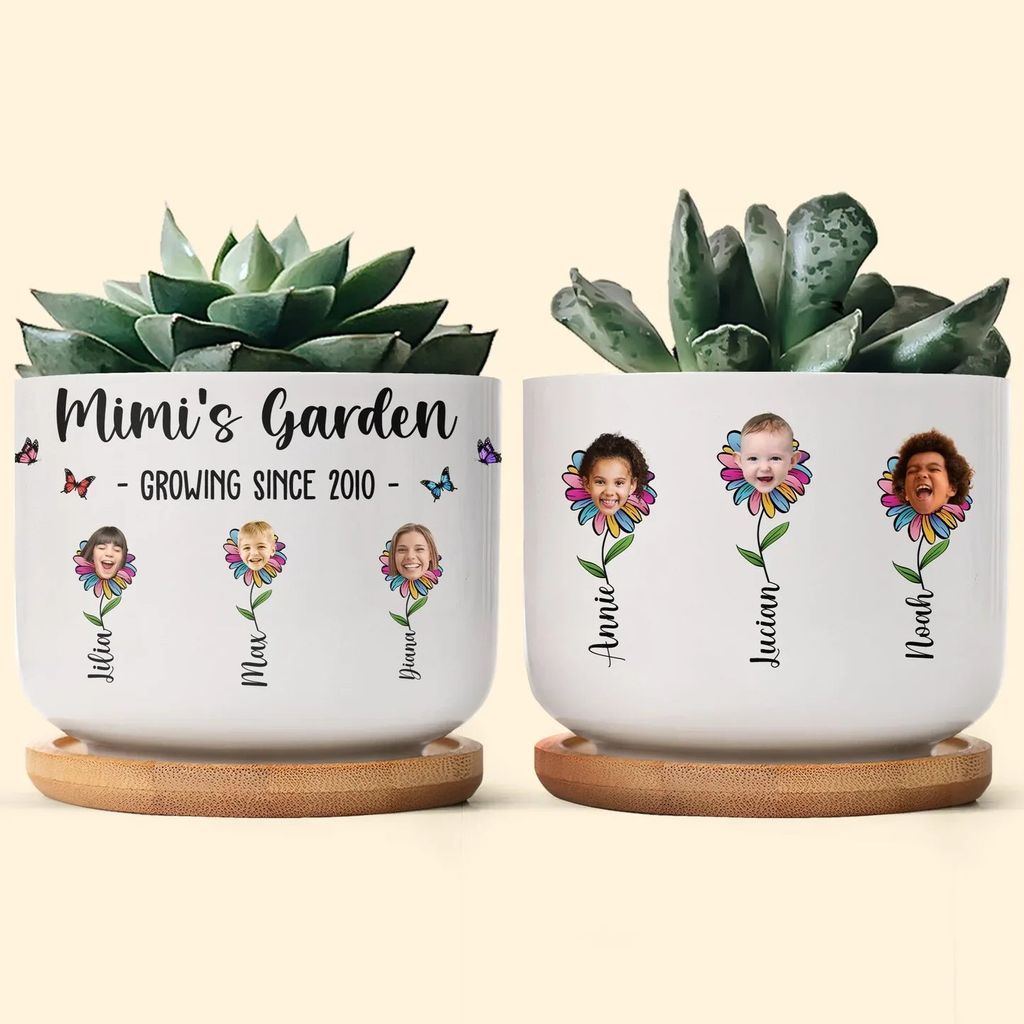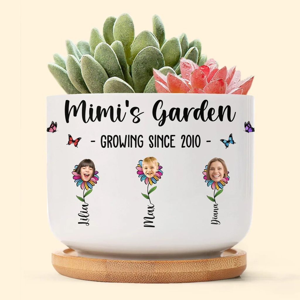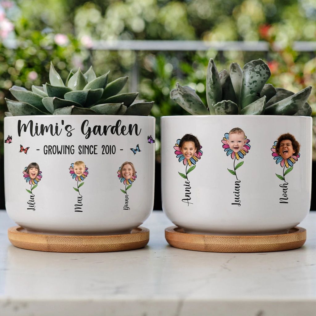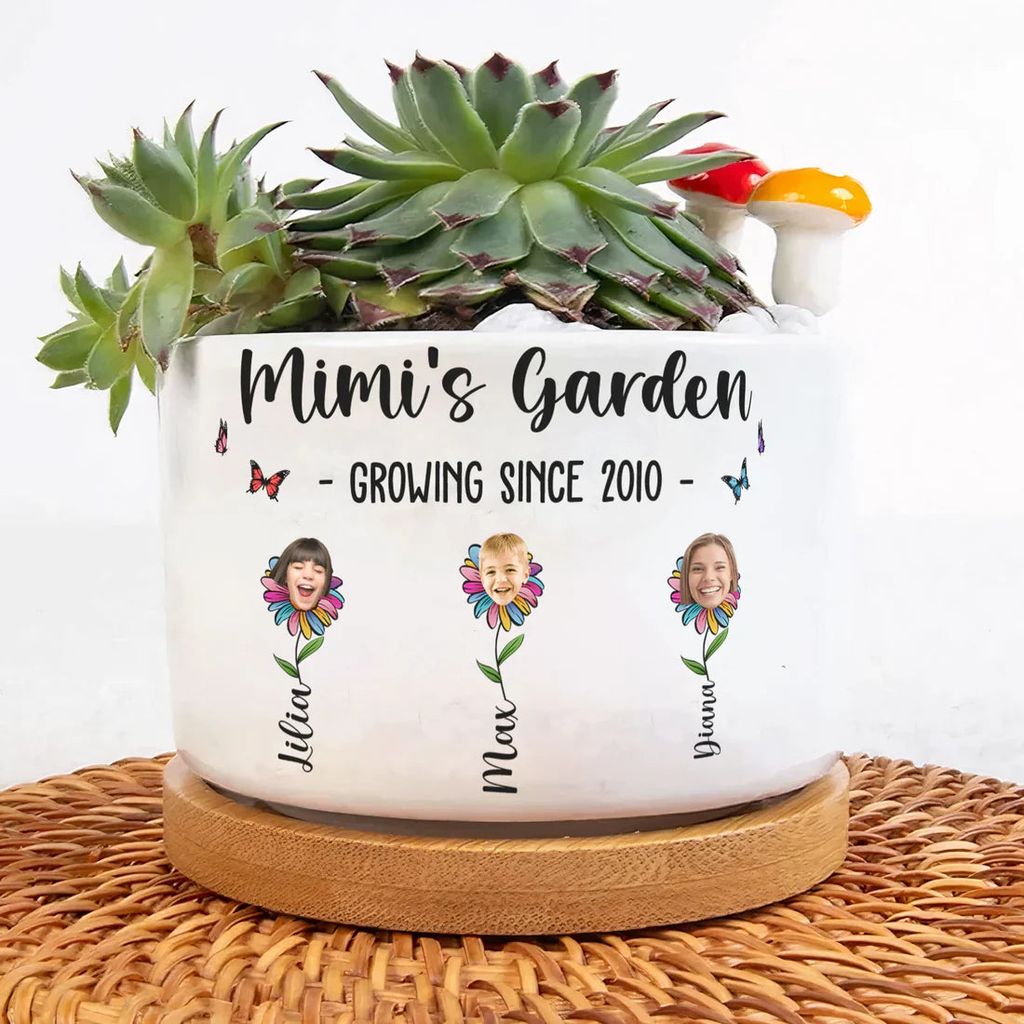 Personalized Ceramic Planter with Tray, Mimi's Garden Flower Faces for Grandma, Unique Gift for Plant Lovers
