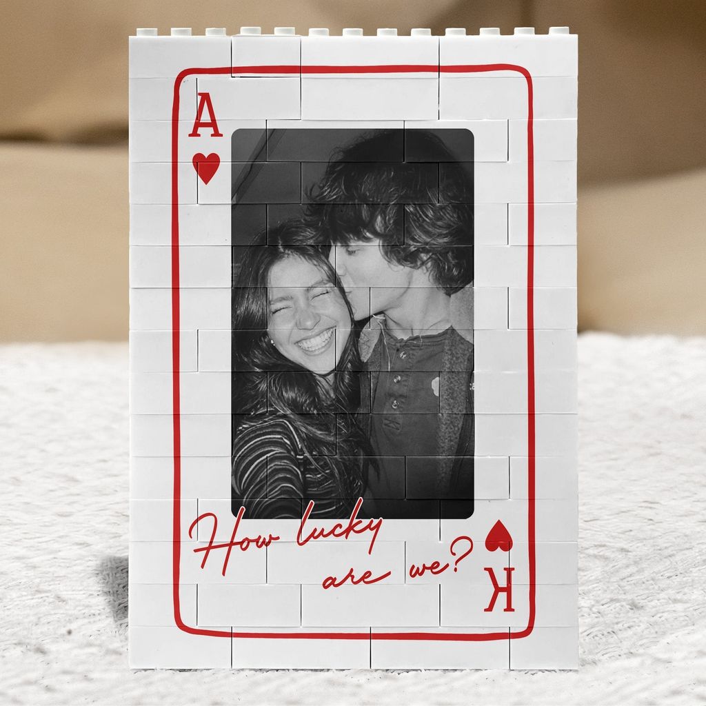The playing-card King and Queen vibe, the black-and-white photo look, and the sweet 'How lucky are we?' message make it feel romantic and real. It is the kind of keepsake you will actually want out on display.