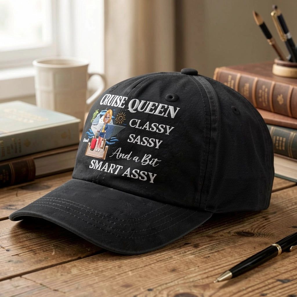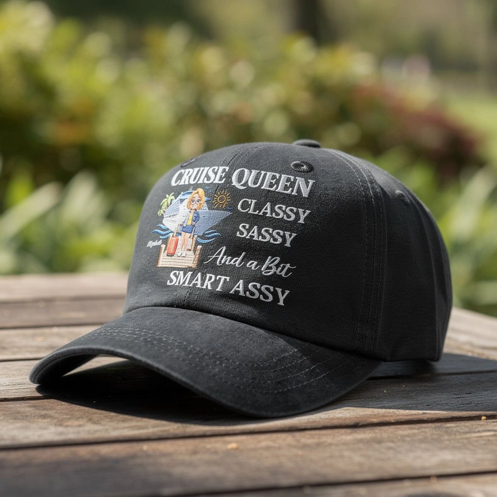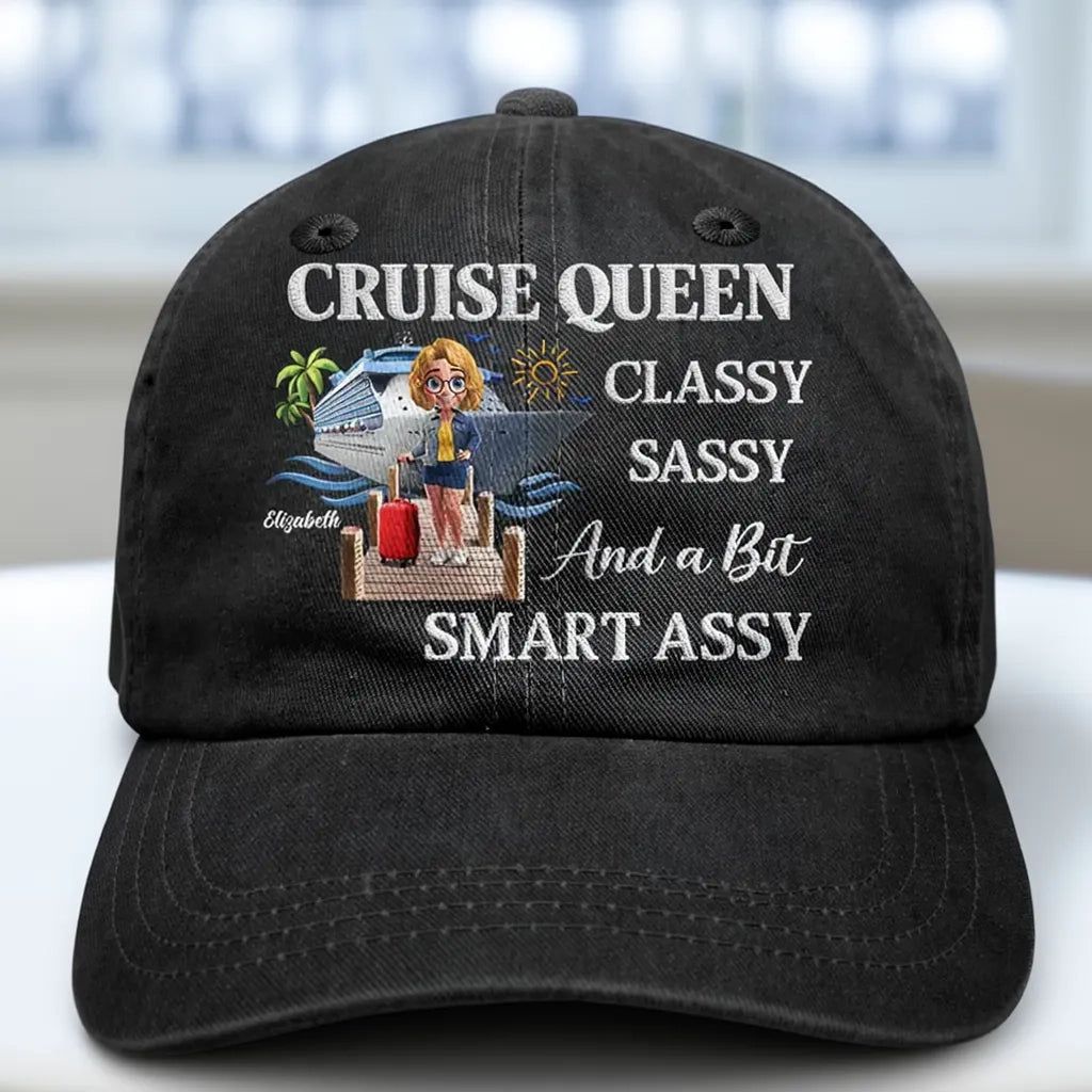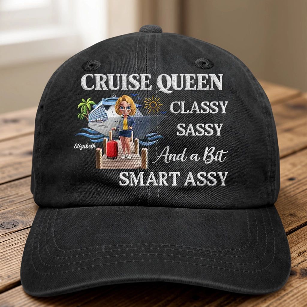 Personalized Washed Denim Baseball Cap, Cruise Queen Classy Sassy Graphic, Unique Funny Gift for Travel Lovers