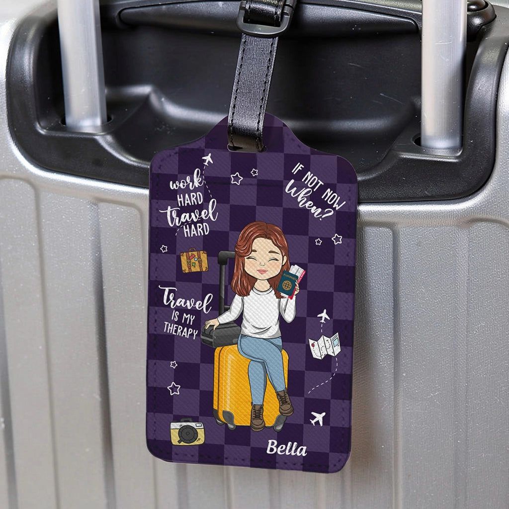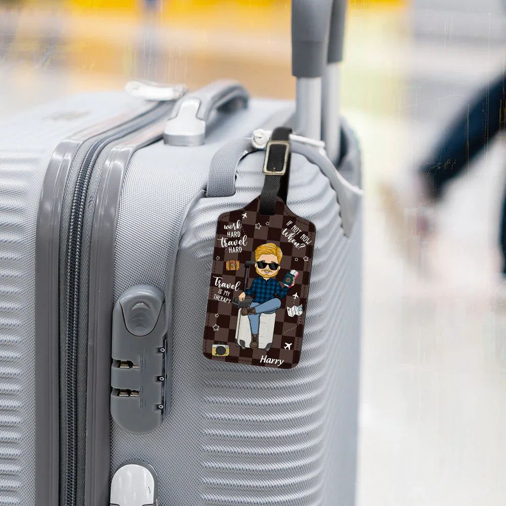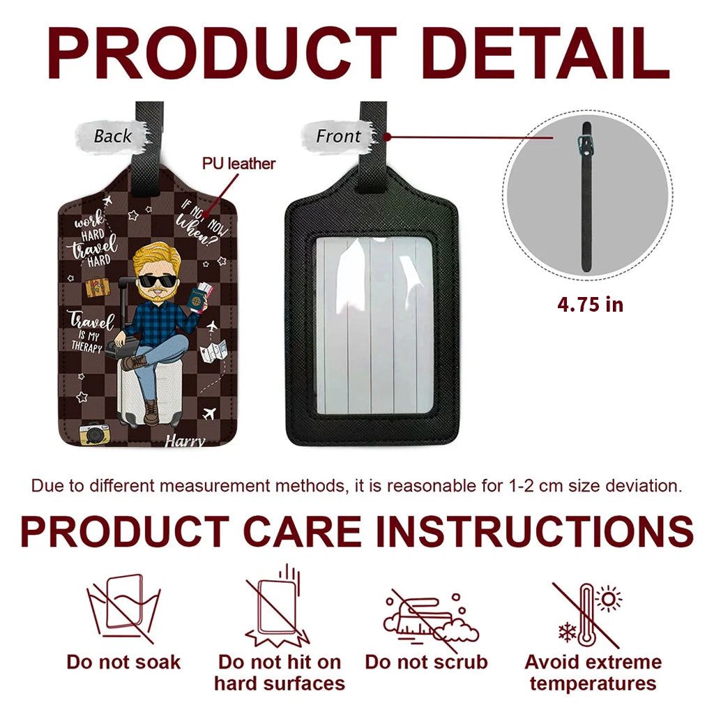 Personalized Leather Luggage Tag, Travel Is My Therapy Cute Cartoon Traveler Design, Unique Gift For Travel Lovers