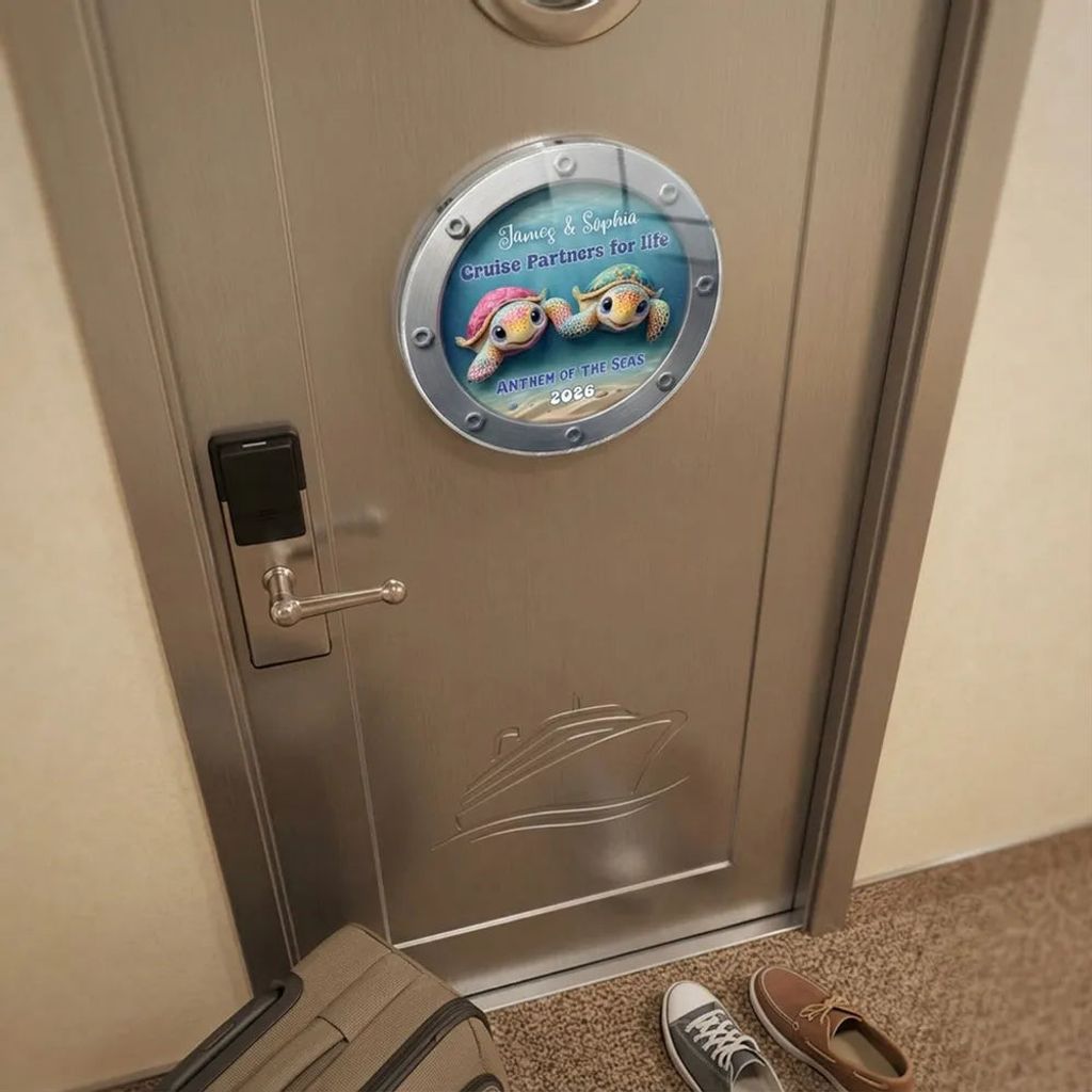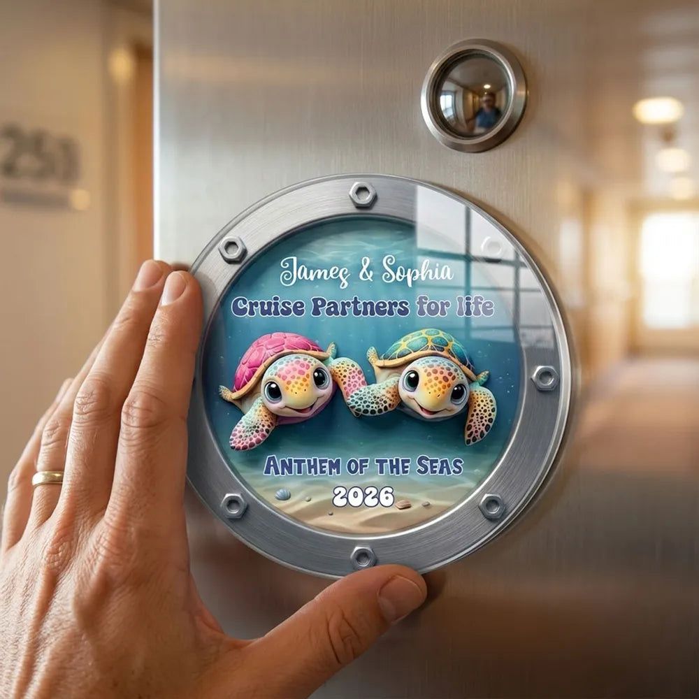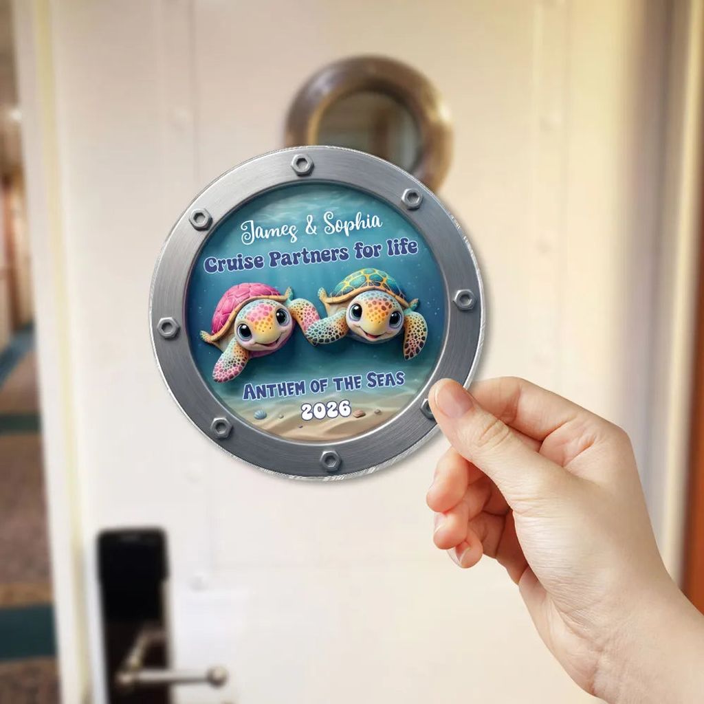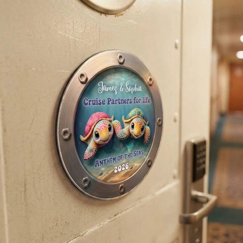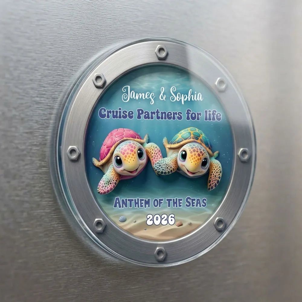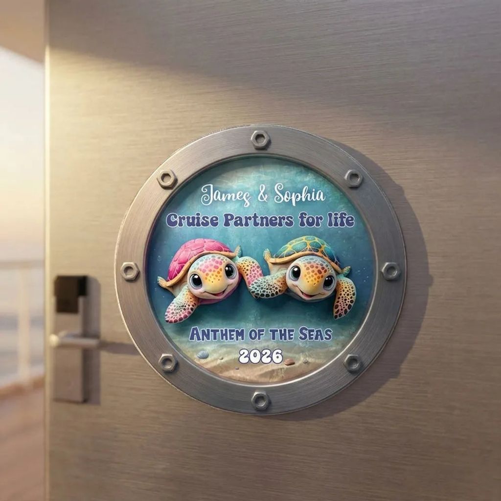 The colorful turtle couple in a porthole-style design gives off fun, ocean-trip energy. It looks adorable on a fridge or cruise cabin door and makes the moment feel saved.