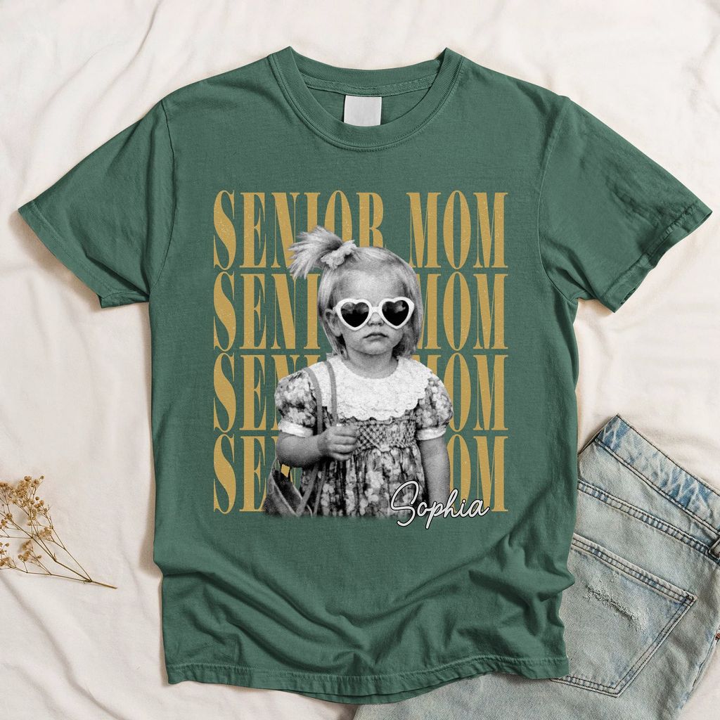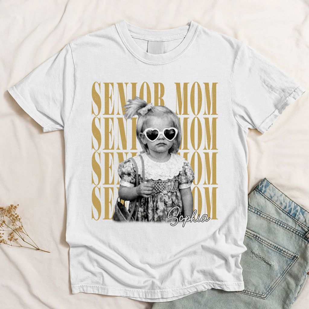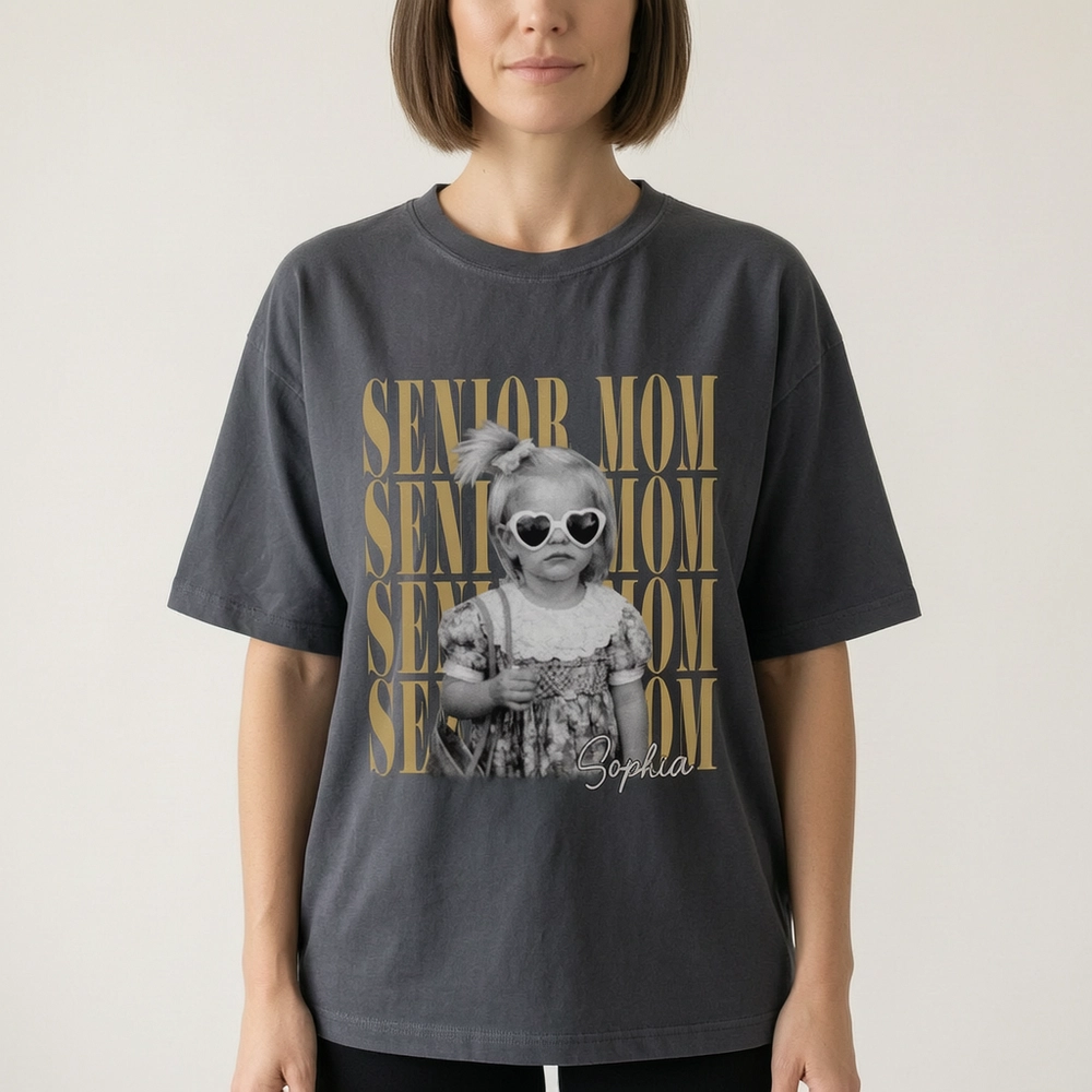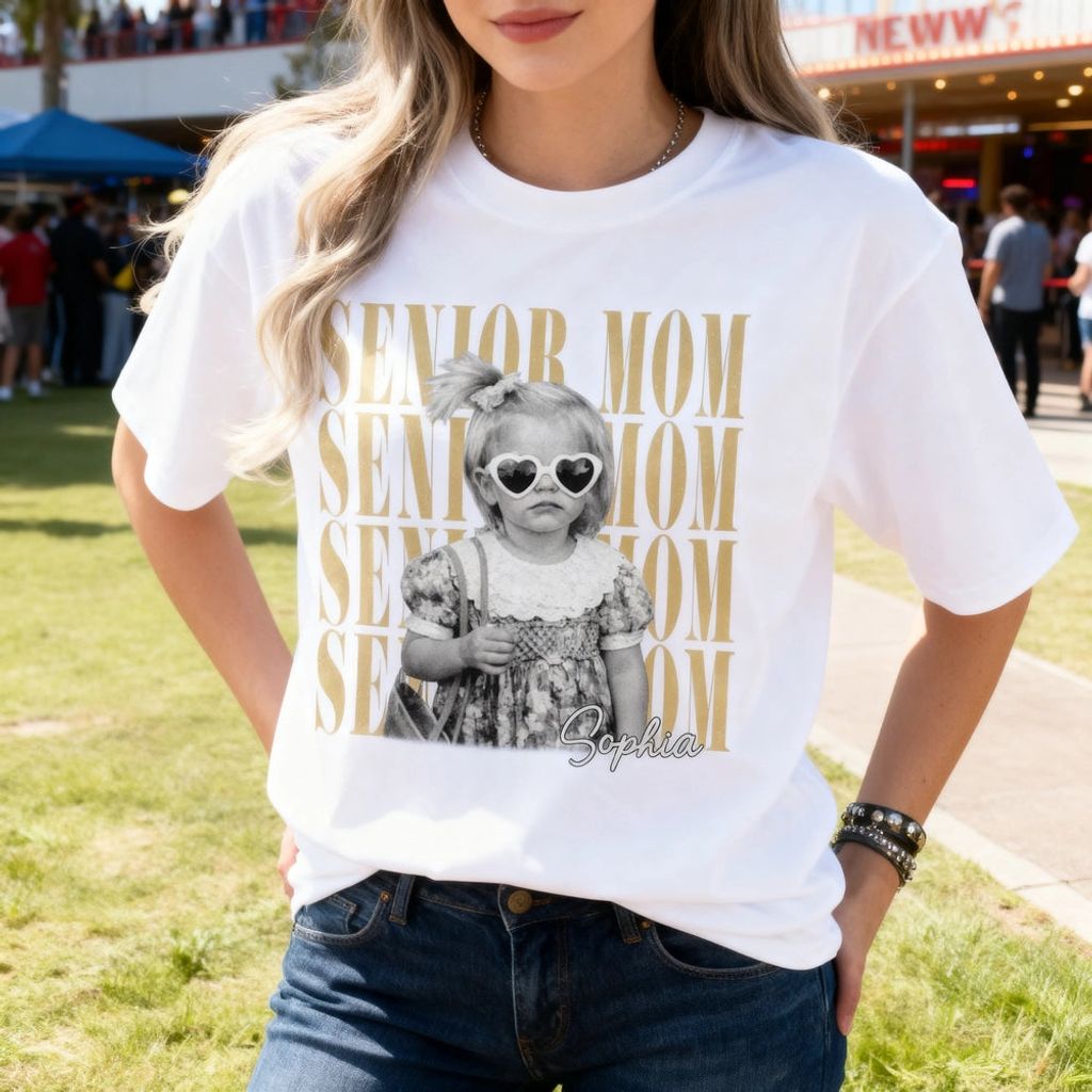 The bold SENIOR MOM lettering, warm gold tones, and throwback photo look create a sweet, nostalgic statement. It is perfect for cheering on her senior and getting compliments everywhere.