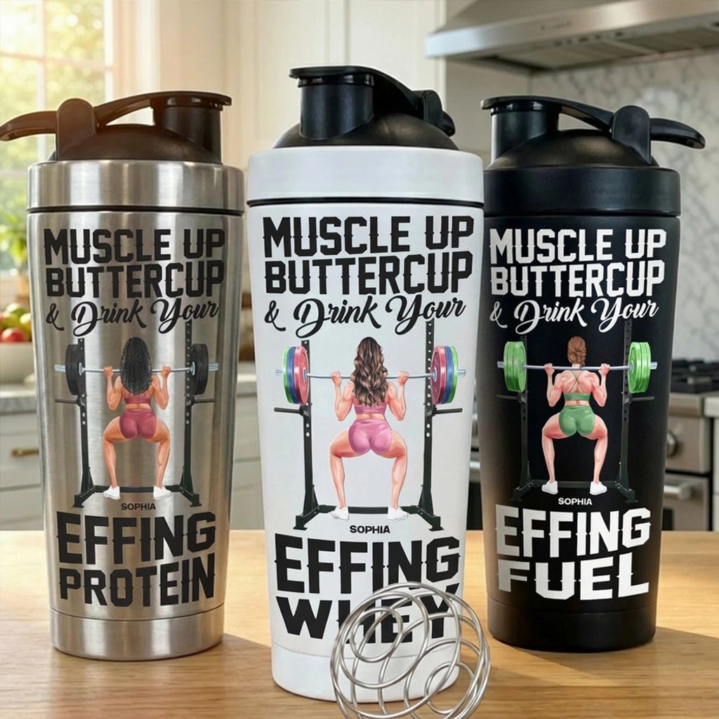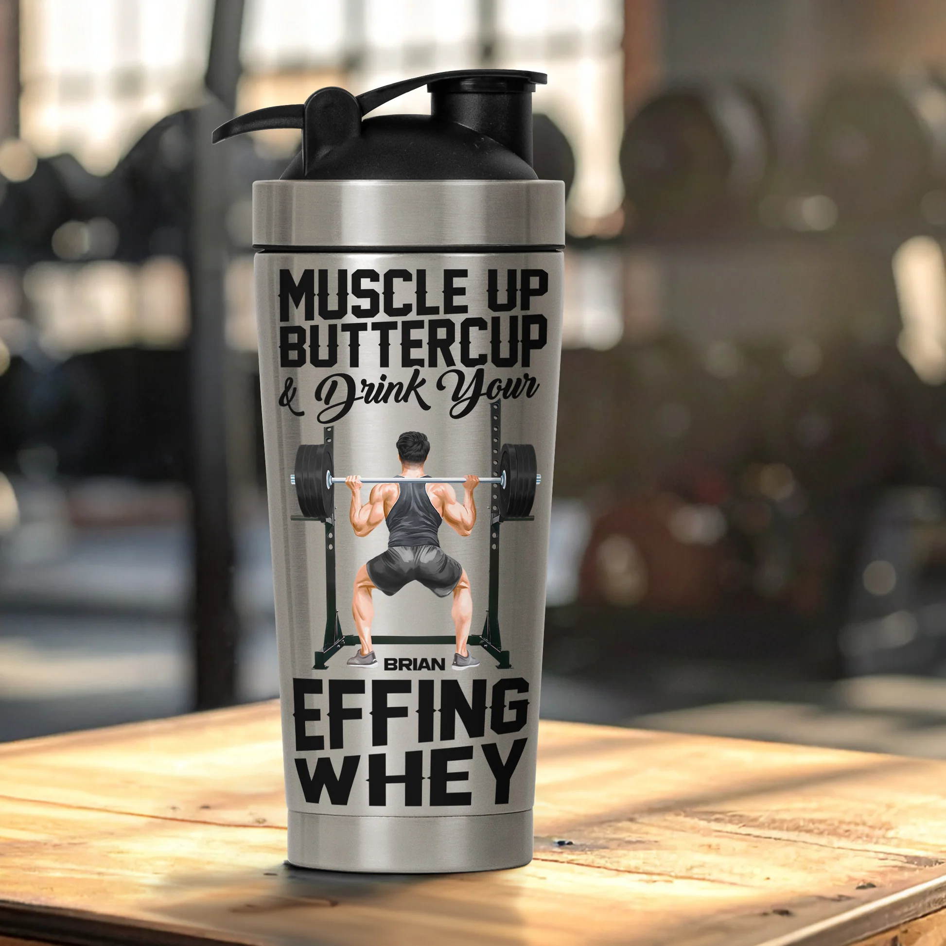 Stainless Steel Protein Shaker, Personalized Muscle Up Buttercup Quote - Unique Fitness Gift for Gym Lovers