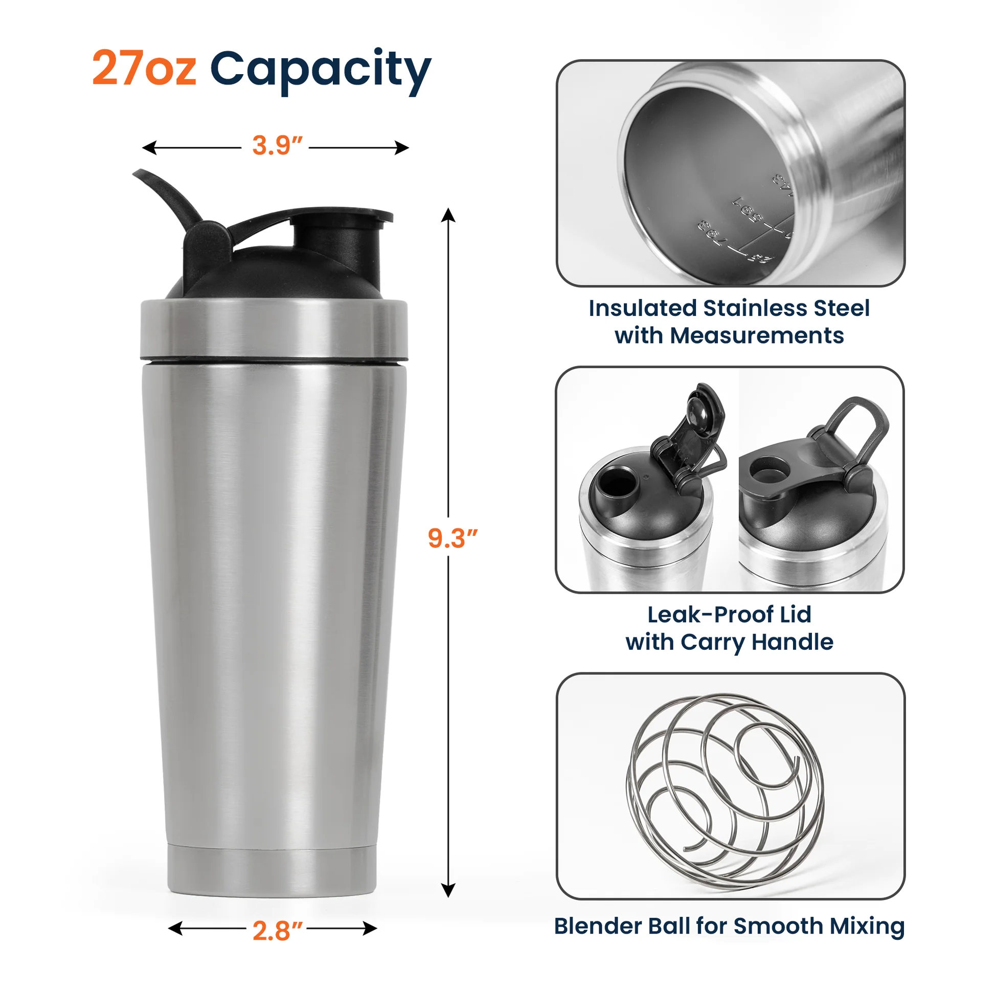 - Features: Stainless steel blender ball and rounded base for smooth mixing; wide-mouth opening with interior measurement markings up to 25 oz; vacuum insulation for temperature retention; ergonomic carry handle for easy portability