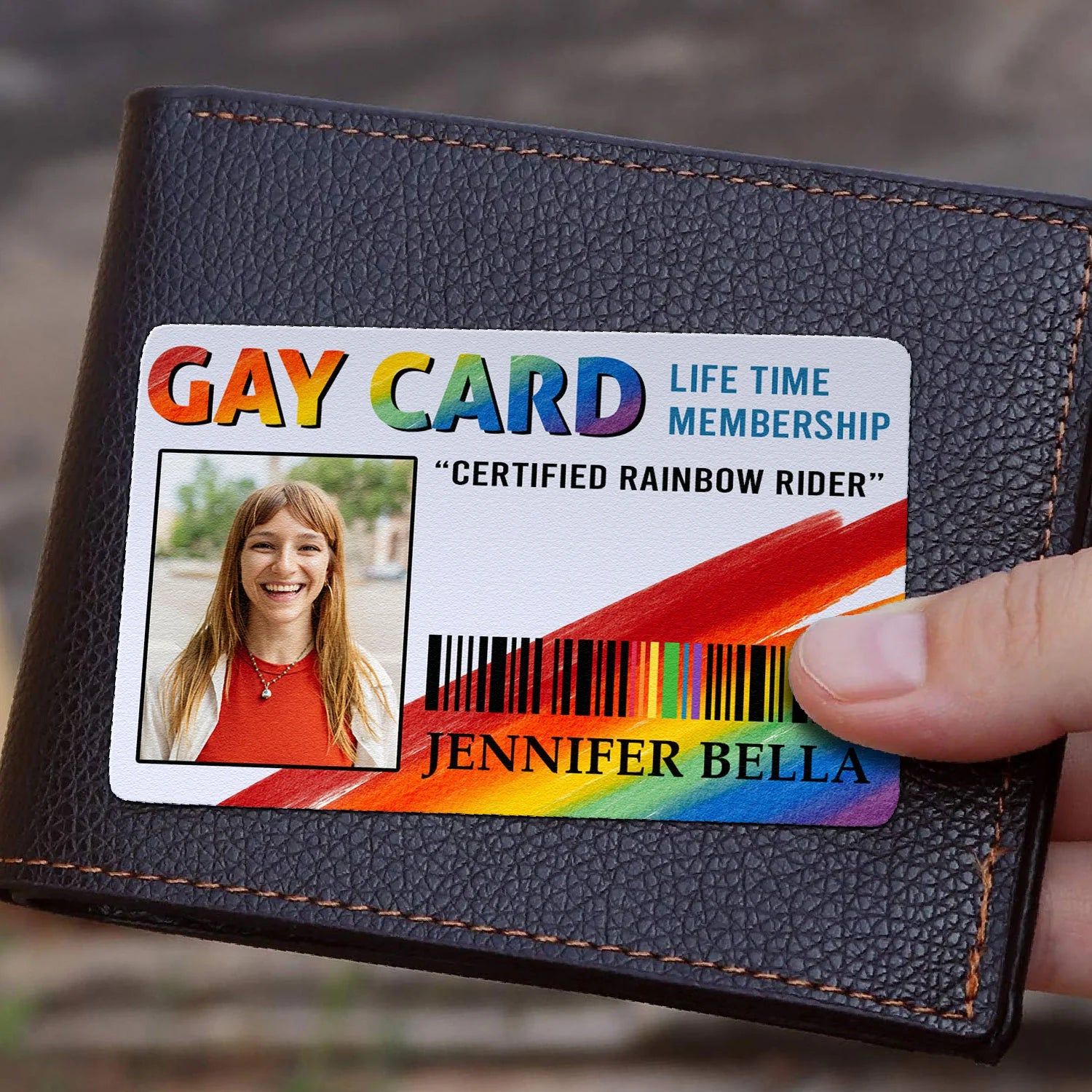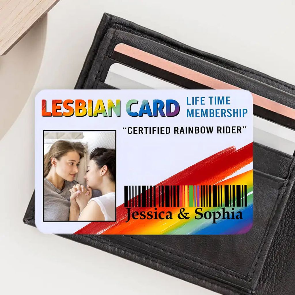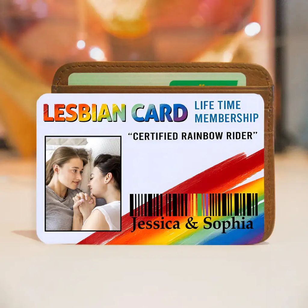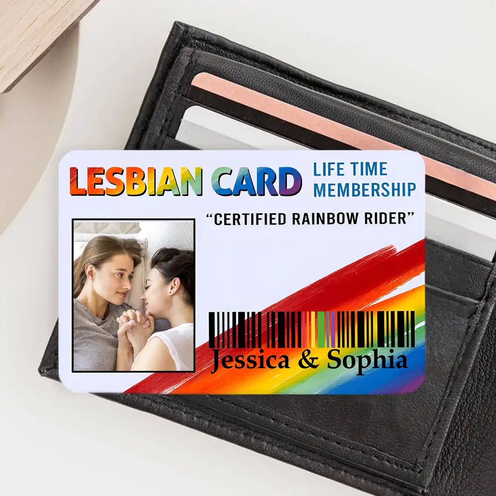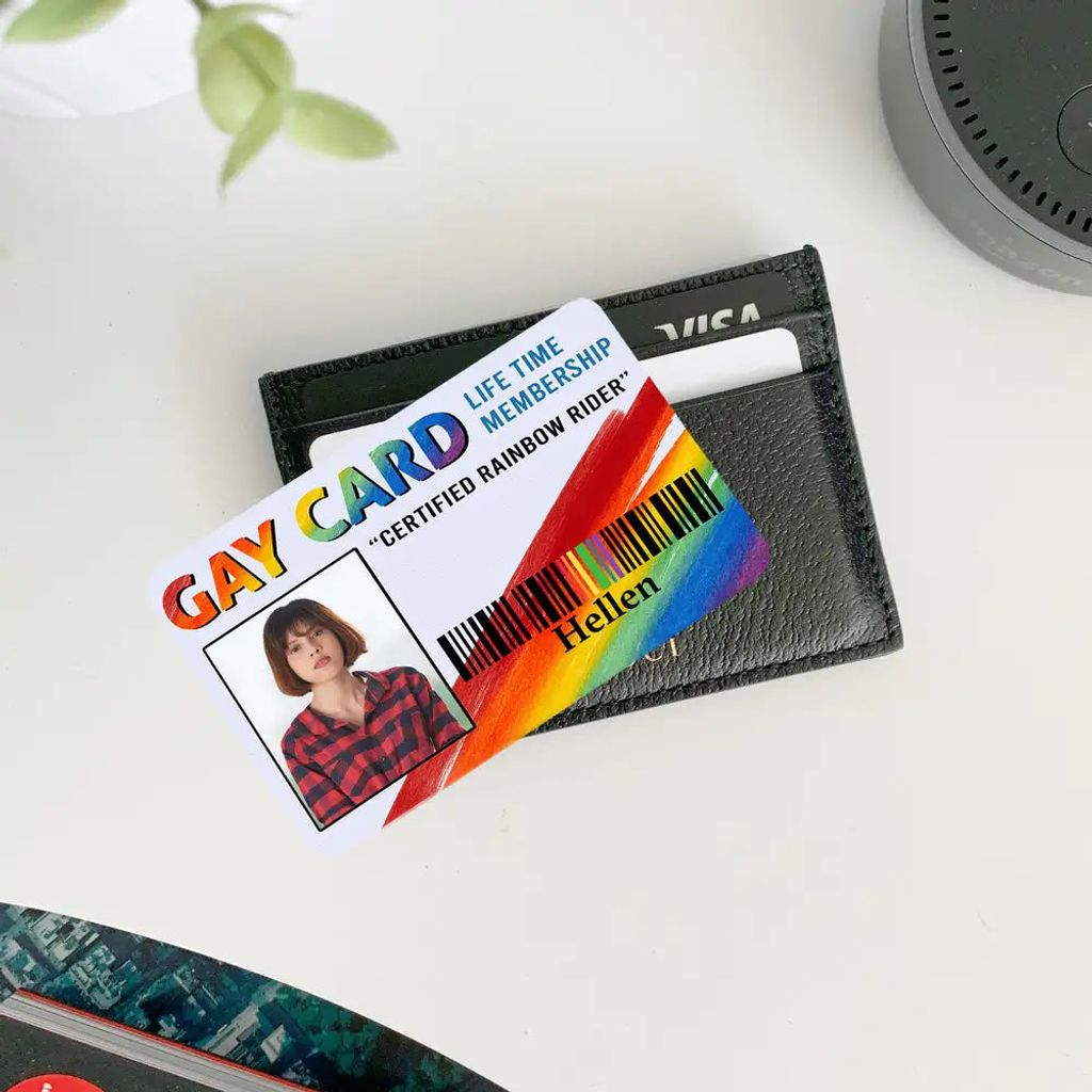 The rainbow-gradient “GAY CARD” celebrates pride and love. Personalized with names, photo, and the title “CERTIFIED RAINBOW RIDER,” it reminds partners of their unique bond every time they open their wallet.