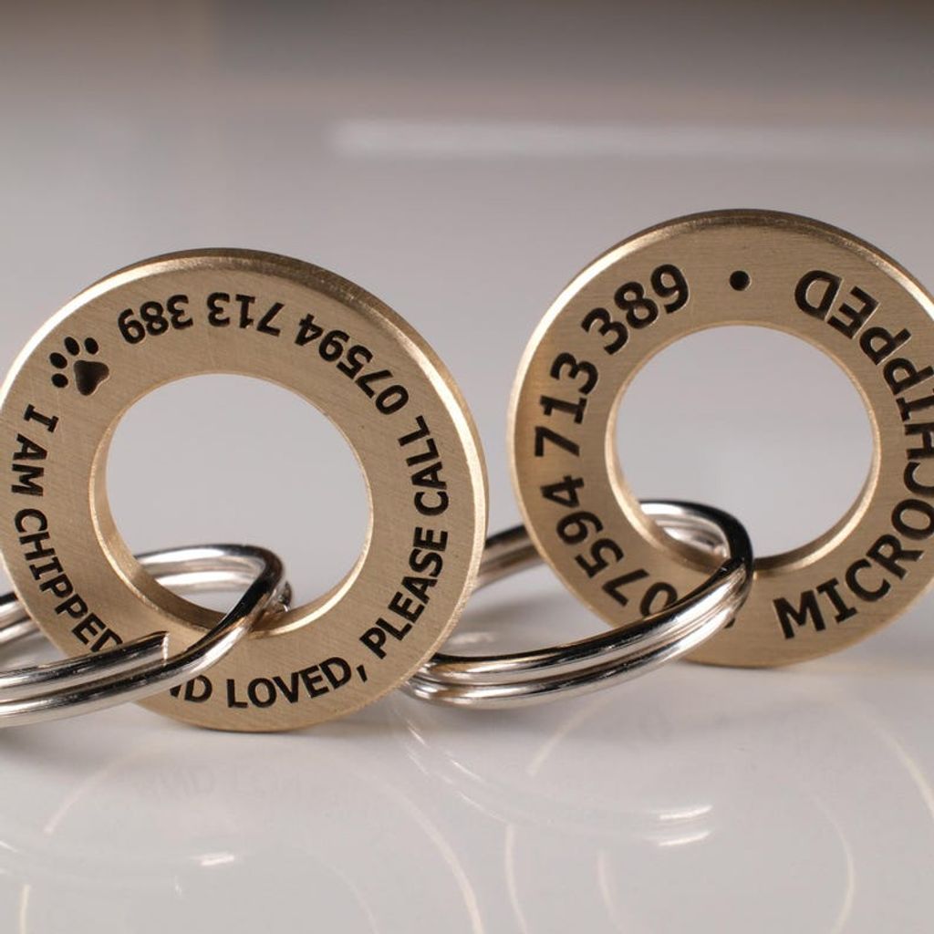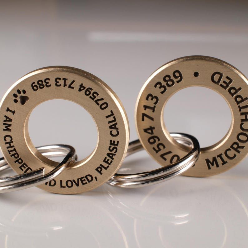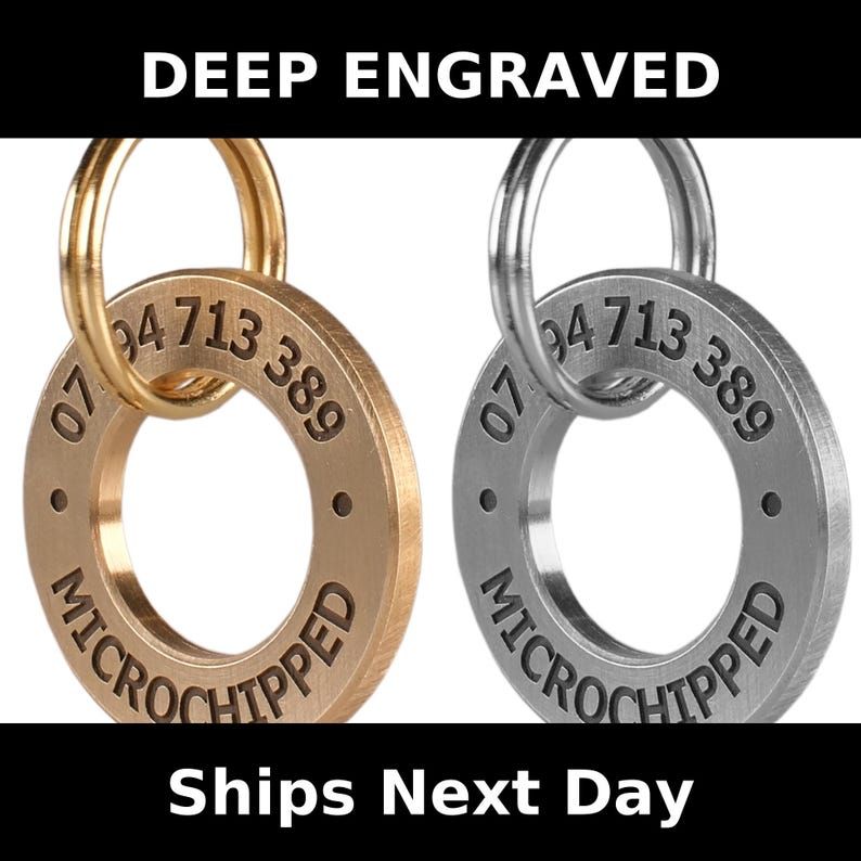 A Small or Large high quality deep engraved Solid Brass or Stainless Steel Tag with a Ten Year Guarantee.