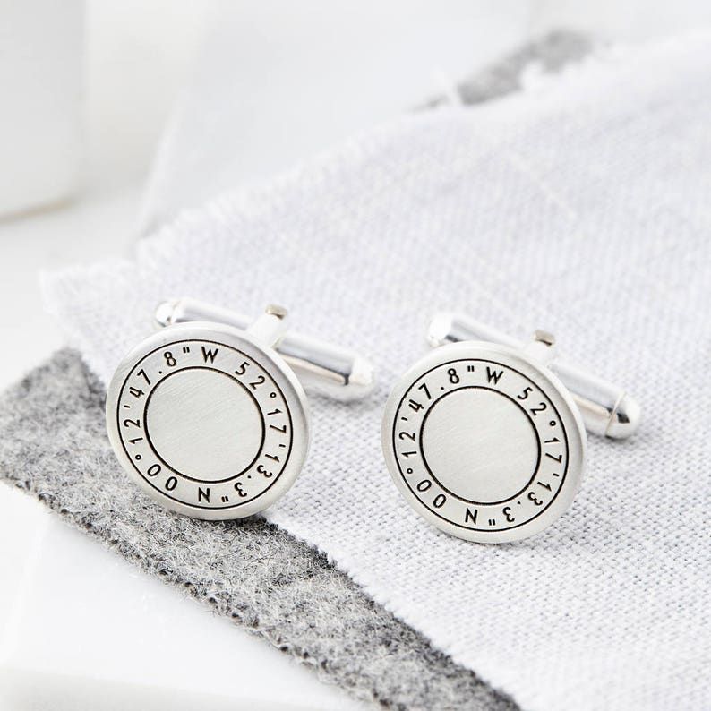Made from sterling silver, these classic cufflinks are engraved with the coordinates of your special location or locations.