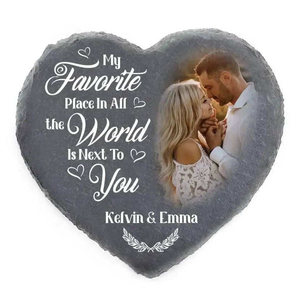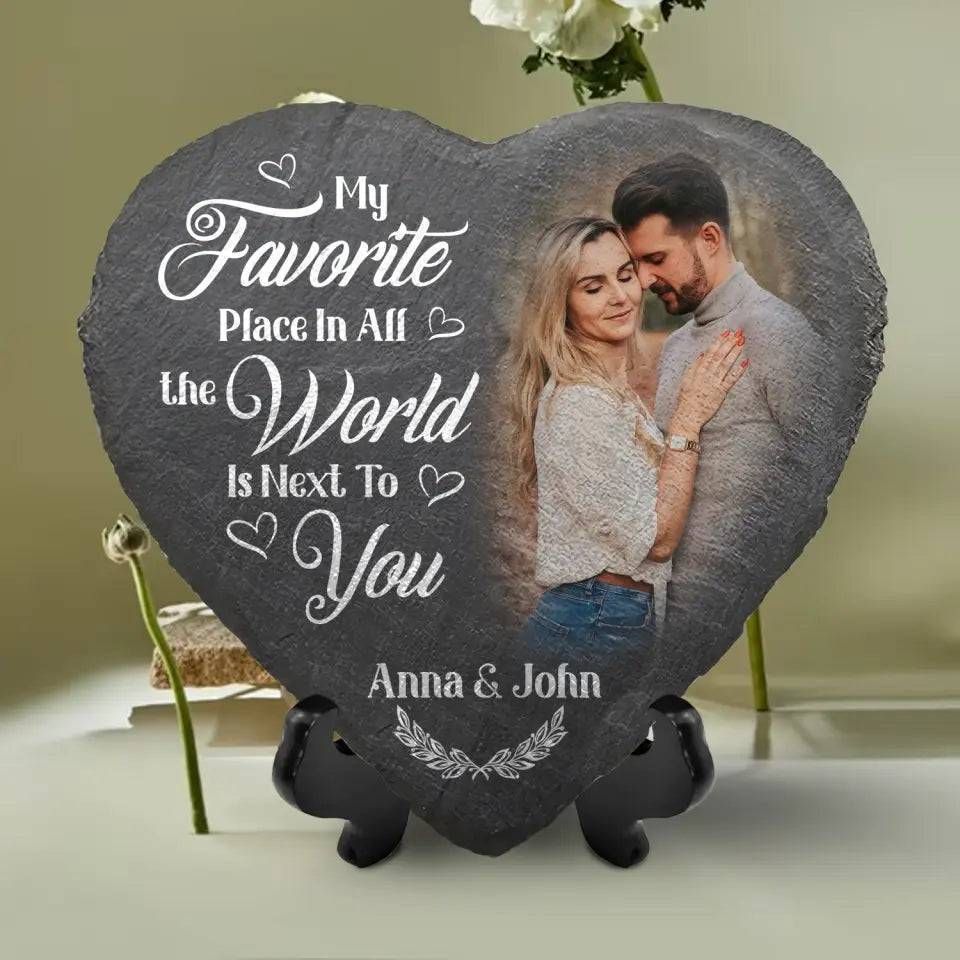 Custom Photo My Favorite Place In All The World Is Next To You - Couple Personalized Custom Heart Shaped Stone With Stand - Gift For Husband Wife, Anniversary