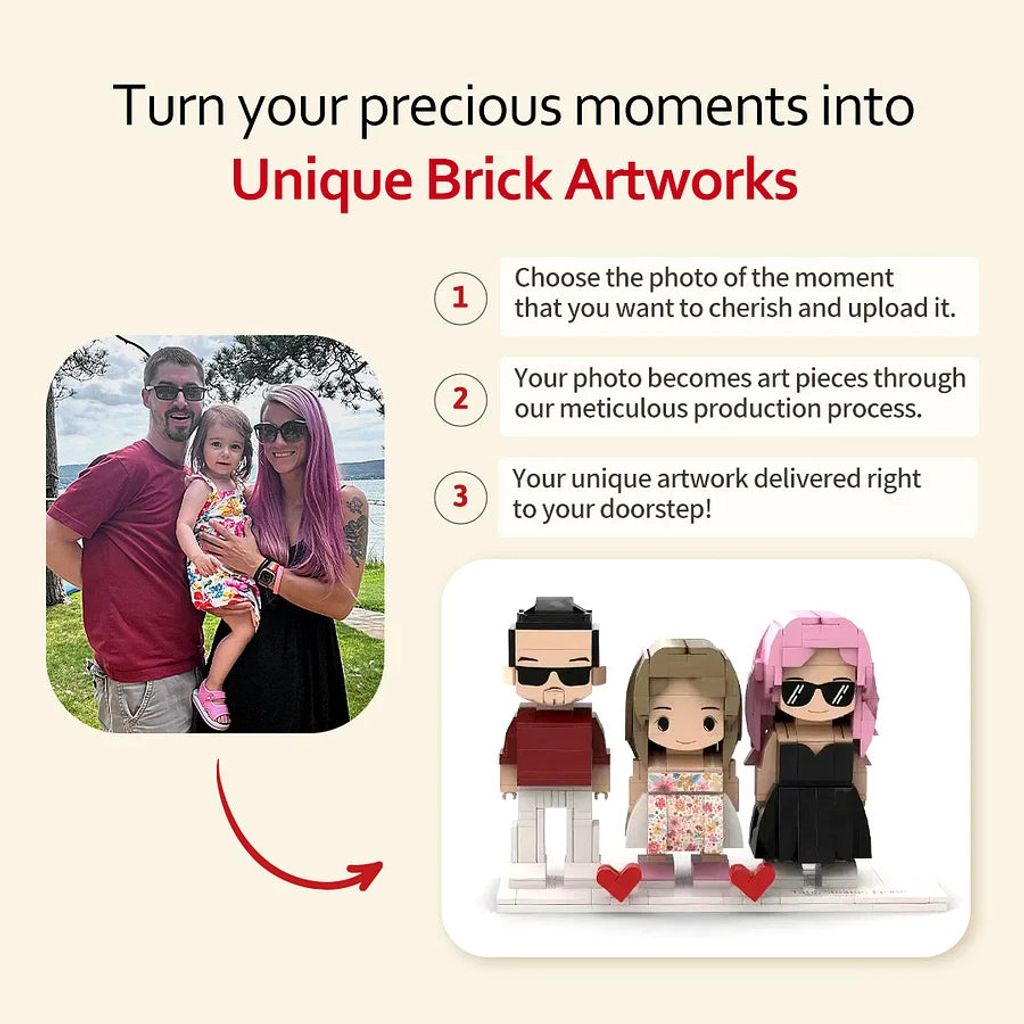 Turn your cherished memories into a one-of-a-kind keepsake with our Custom Brick Set! Simply upload your favorite photo, and we’ll transform it into a detailed brick design.