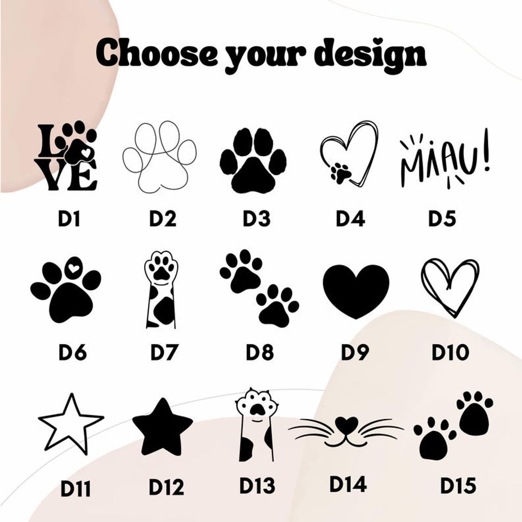 2. In the personalization box, add your pet’s name and the design number (D1–D15)