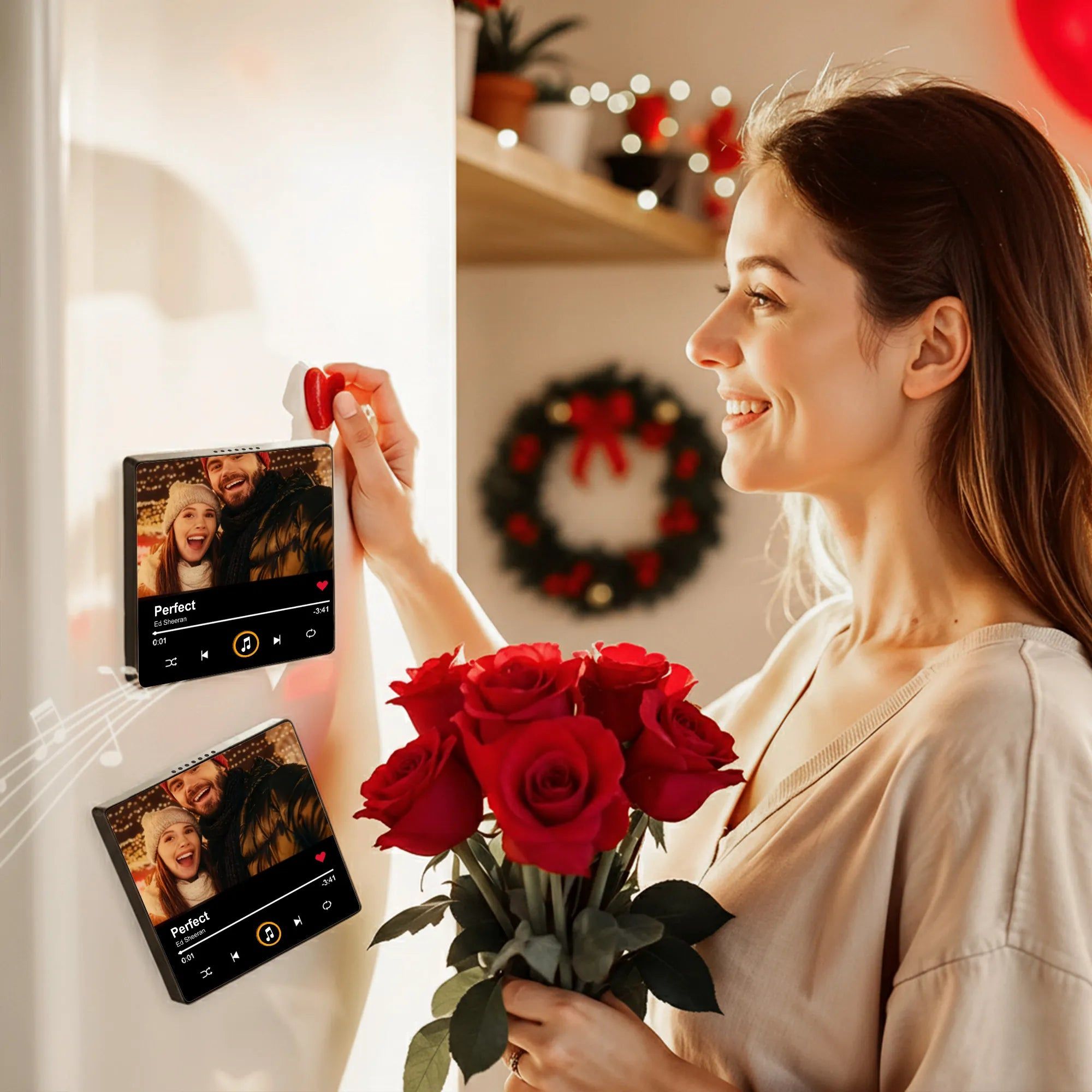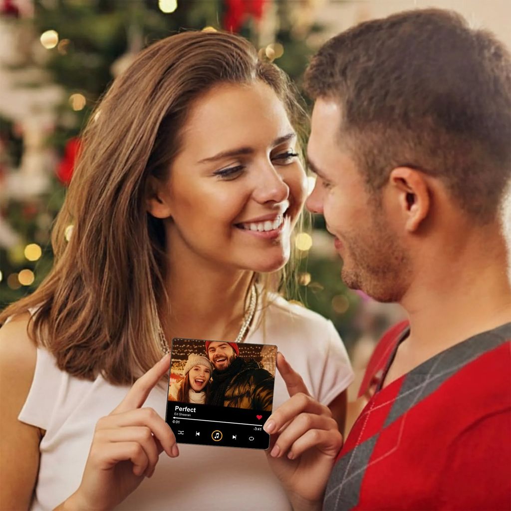 The warm lights, Christmas tree decor and close-up couple pose bring a romantic holiday vibe to your fridge or metal surface. Add your own photo to relive that heartwarming moment every time the music-style display catches your eye.