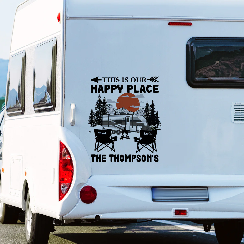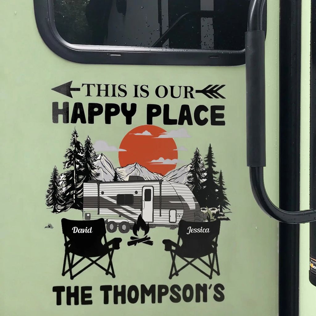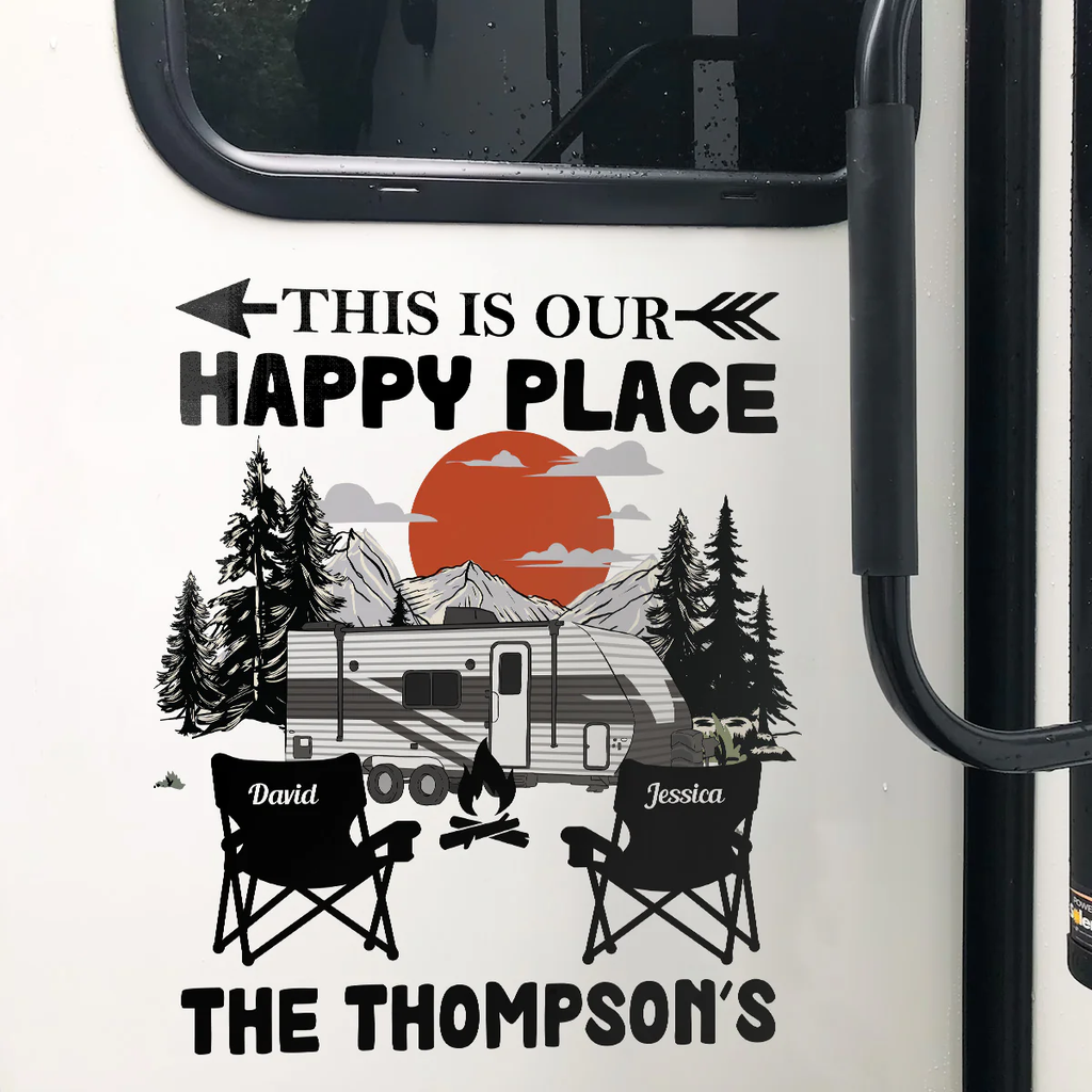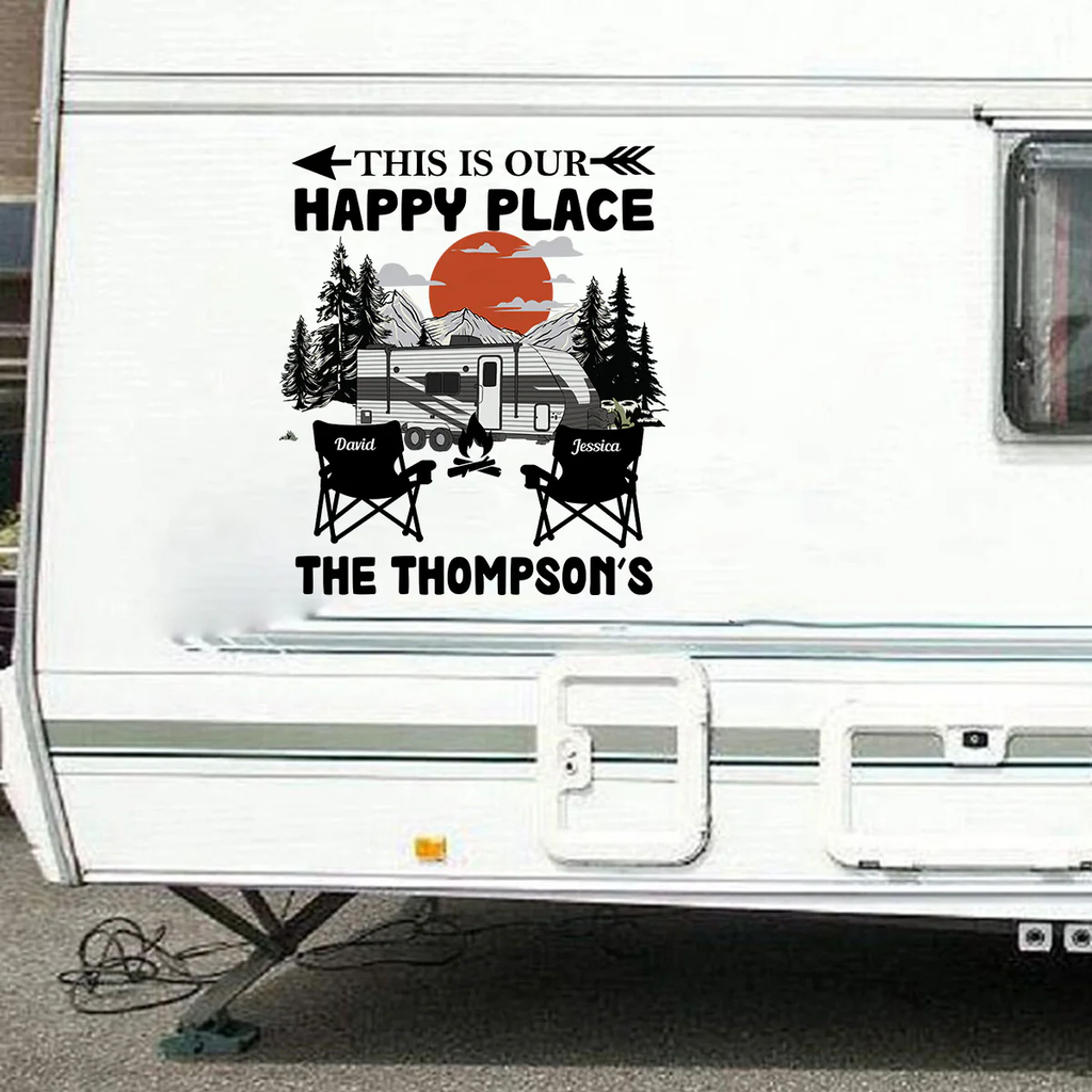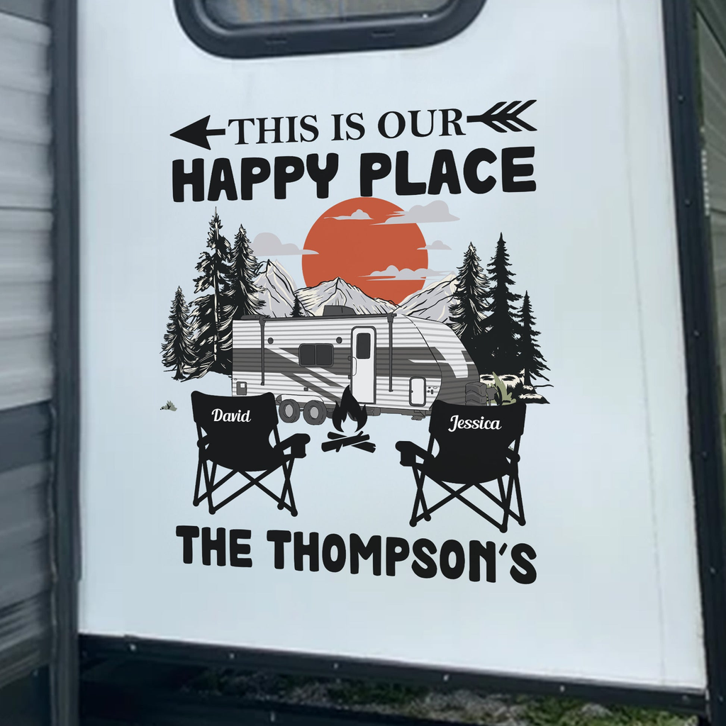 Featuring the phrase 'THIS IS OUR HAPPY PLACE' with a mountain sunset, trees, an RV, camp chairs, and a campfire. The bold black artwork with a warm orange sun looks clean, crisp, and instantly welcoming.