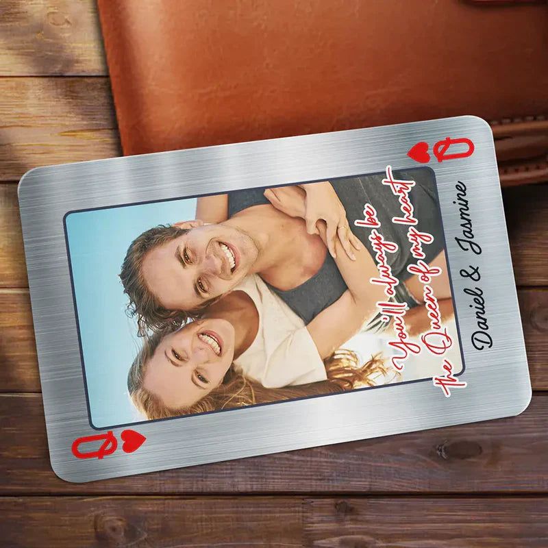The design features a laughing couple hugging in warm sunset light by the beach, plus the sweet message 'You'll Always Be The Queen Of My Heart' with a playing-card touch for a romantic, modern look.