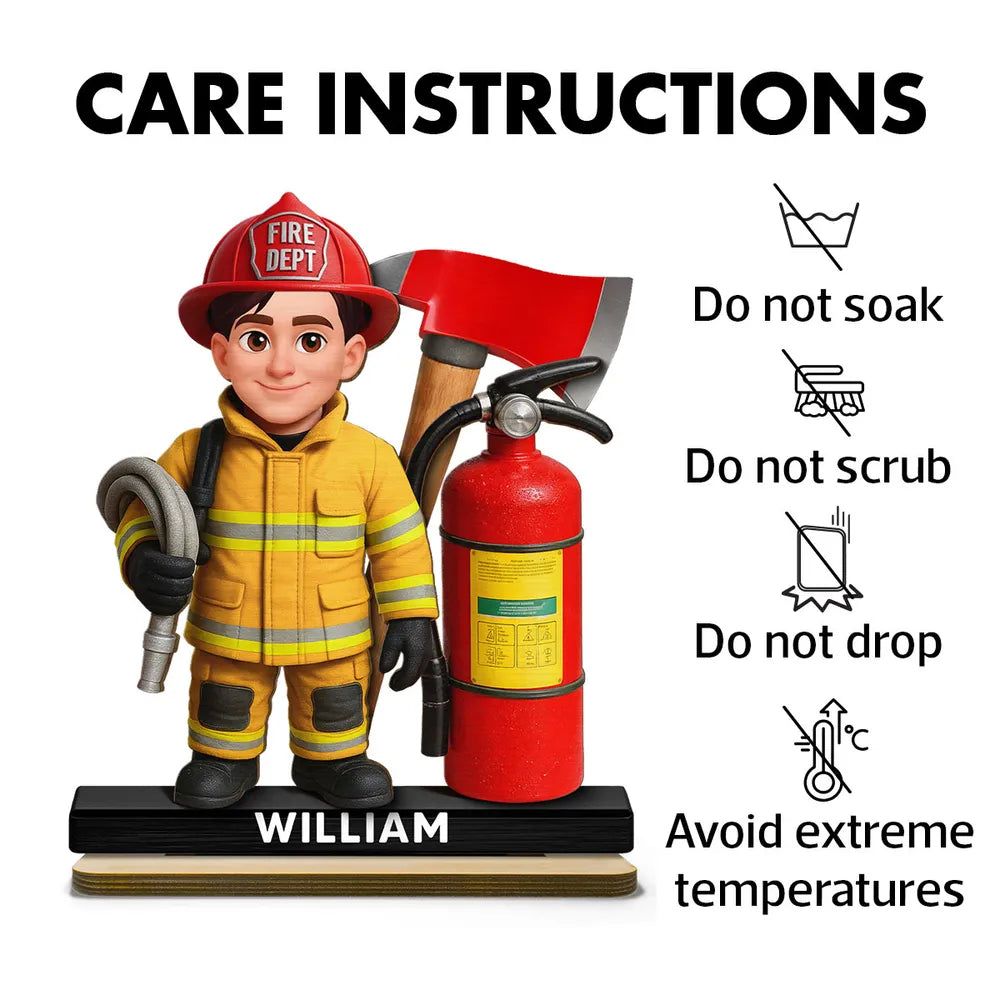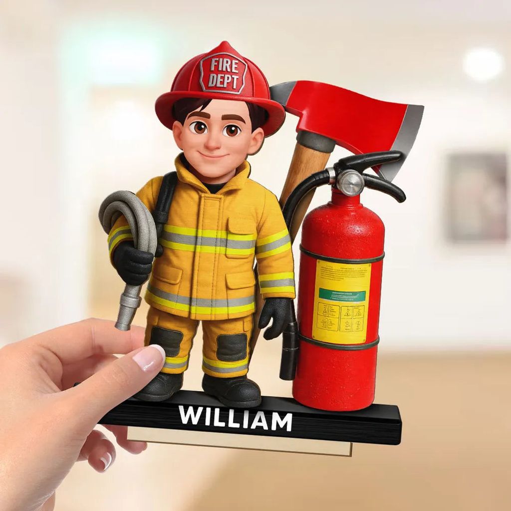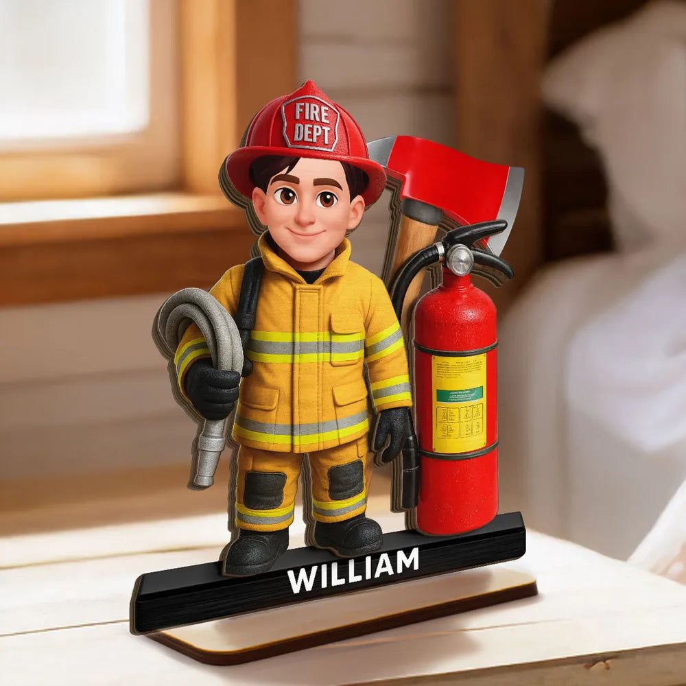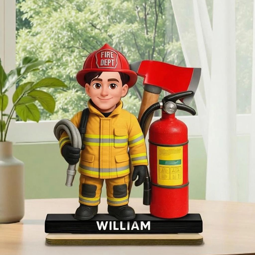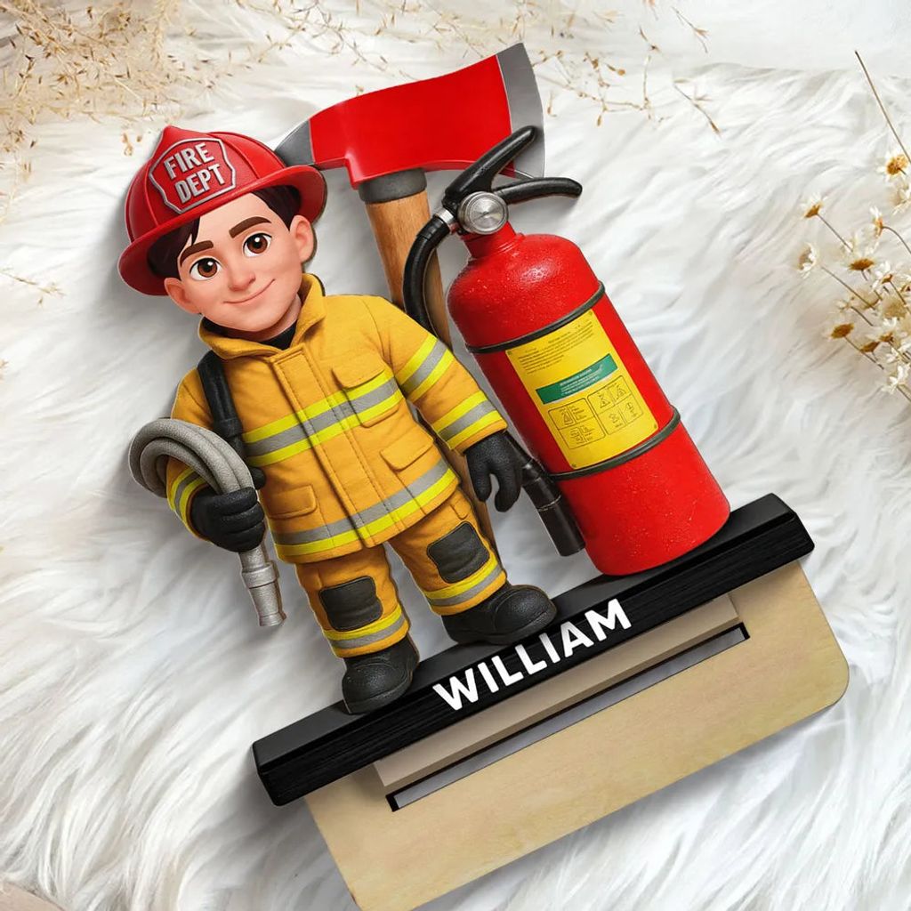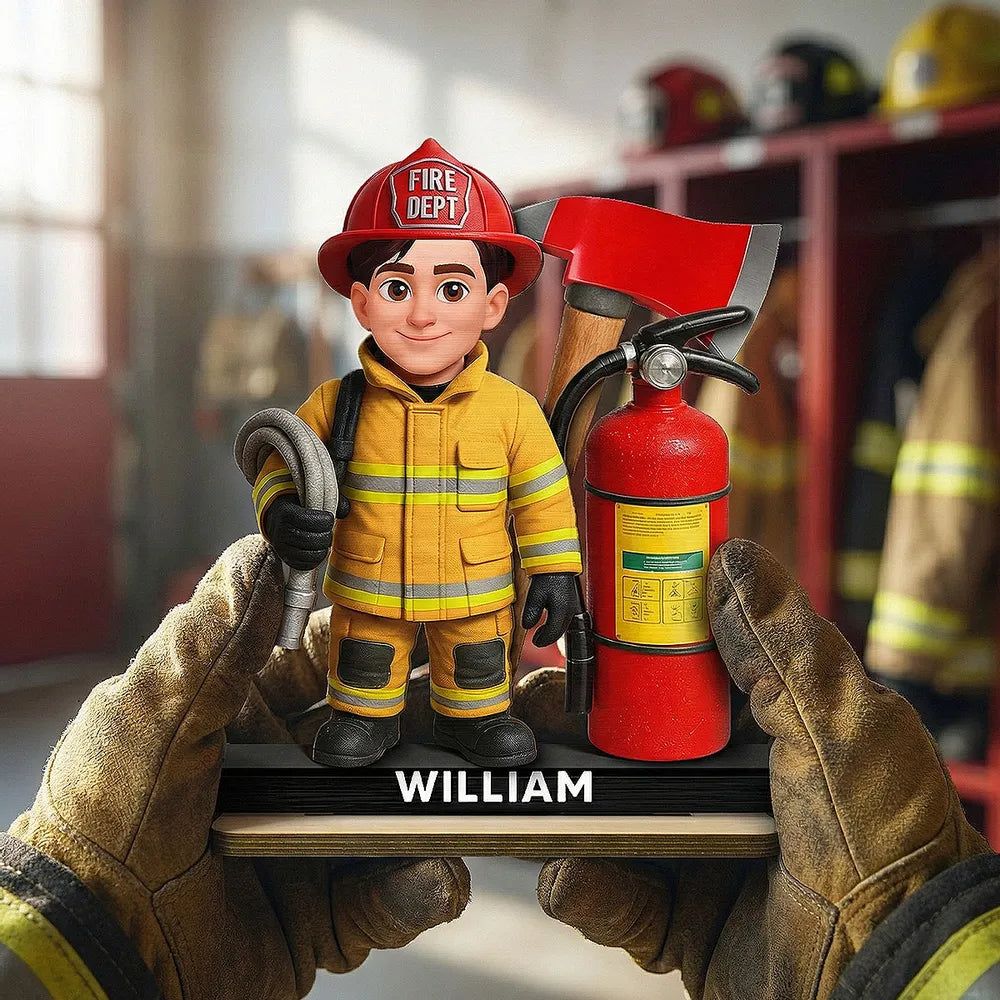 The design features a firefighter character in full gear with a bold fire axe and extinguisher, in warm red and yellow tones. It looks amazing on a desk or shelf and instantly adds a proud, hardworking vibe.