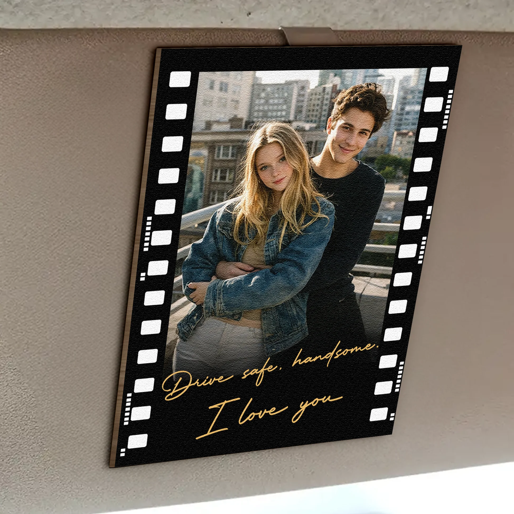 The black film-frame look and warm gold script give it that nostalgic vibe. The message says 'Drive safe, handsome. I love you' for a sweet reminder every time they glance up.