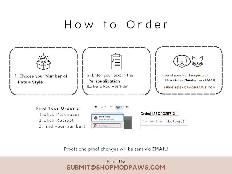 4. Send us your pet's photo by emailing us at submit [!at] shopmodpaws.com with your Order Number. Please refer to our photo guidelines in our images to ensure the best quality looking print!