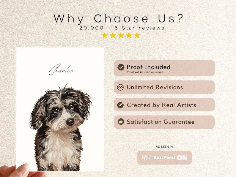 4. We suggest no accessories on the pet(s) to better capture all their unique features. If accessories are included in the provided image, they will be included in the portrait unless requested otherwise.
