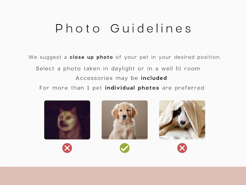 📸PHOTO GUIDELINES (REFER TO EXAMPLE IN PHOTOS) These are simply guidelines, we can work with anything, just try to provide the BEST photo possible. Feel free to provide as many photos as you wish. For multiple pet orders, feel free to provide individual photos of each pet.
